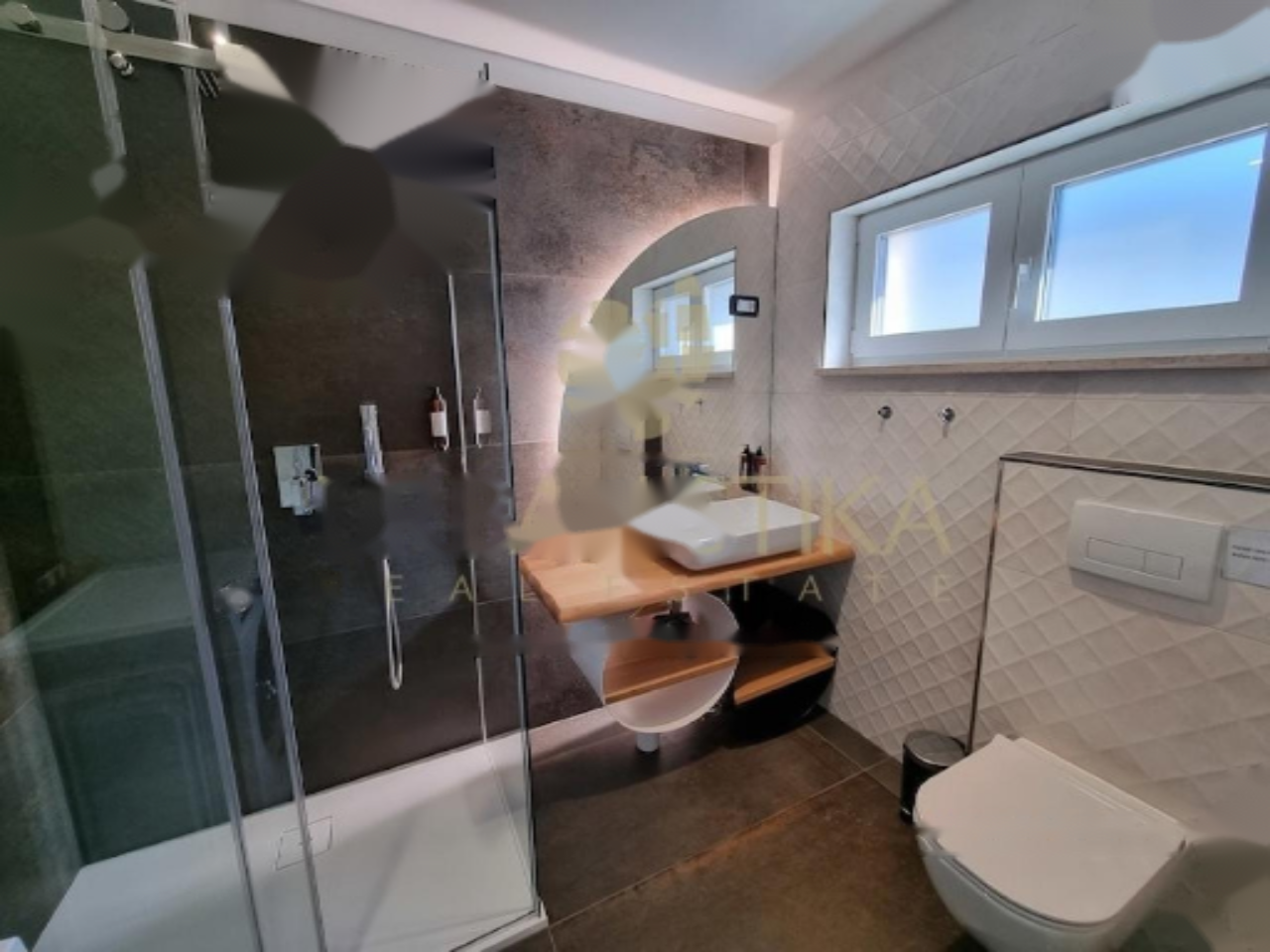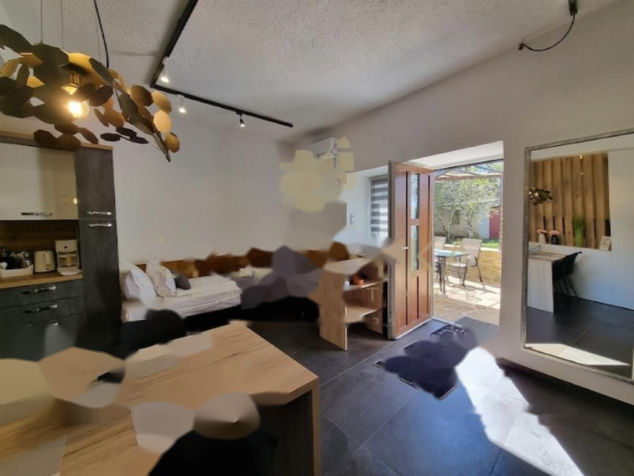Недвижимость состоит из двух соединенных домов, в каждом из которых имеются 4 независимых жилых блока с личными входами, что подходит для комфортного проживания и сдачи в аренду. Первый дом, выполненный в стиле средиземноморья, был полностью обновлен в 2023 году. На его первом этаже расположены два небольших апартамента площадью 42,51 м² и 22,91 м². Второй этаж занимает современный апартамент площадью 64,48 м² с отлично обустроенной гостиной, двумя спальнями и ванной комнатой, дополненный балконом и крытой террасой. Подогреваемые полы и новая стильная мебель обеспечивают высочайший уровень комфорта.