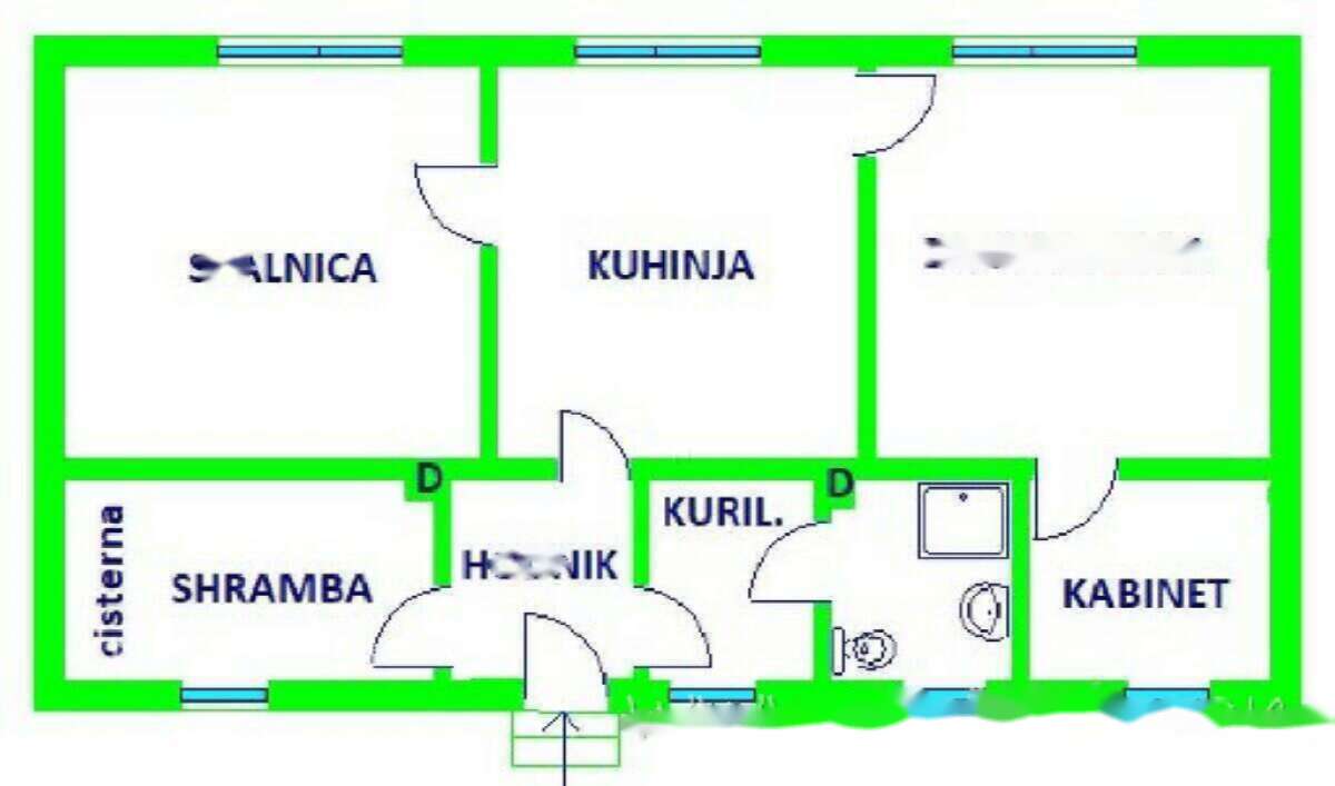 Дом включает в себя: прихожую, откуда можно попасть в кладовую слева, расположенную рядом с топливным резервуаром и входом на неотделанный чердак; справа — котельная и ванная комната. Кухня, находящаяся прямо по коридору, ведет в гостиную, откуда можно пройти в кабинет и спальню. Полы в доме из теплых покрытий и керамической плитки.