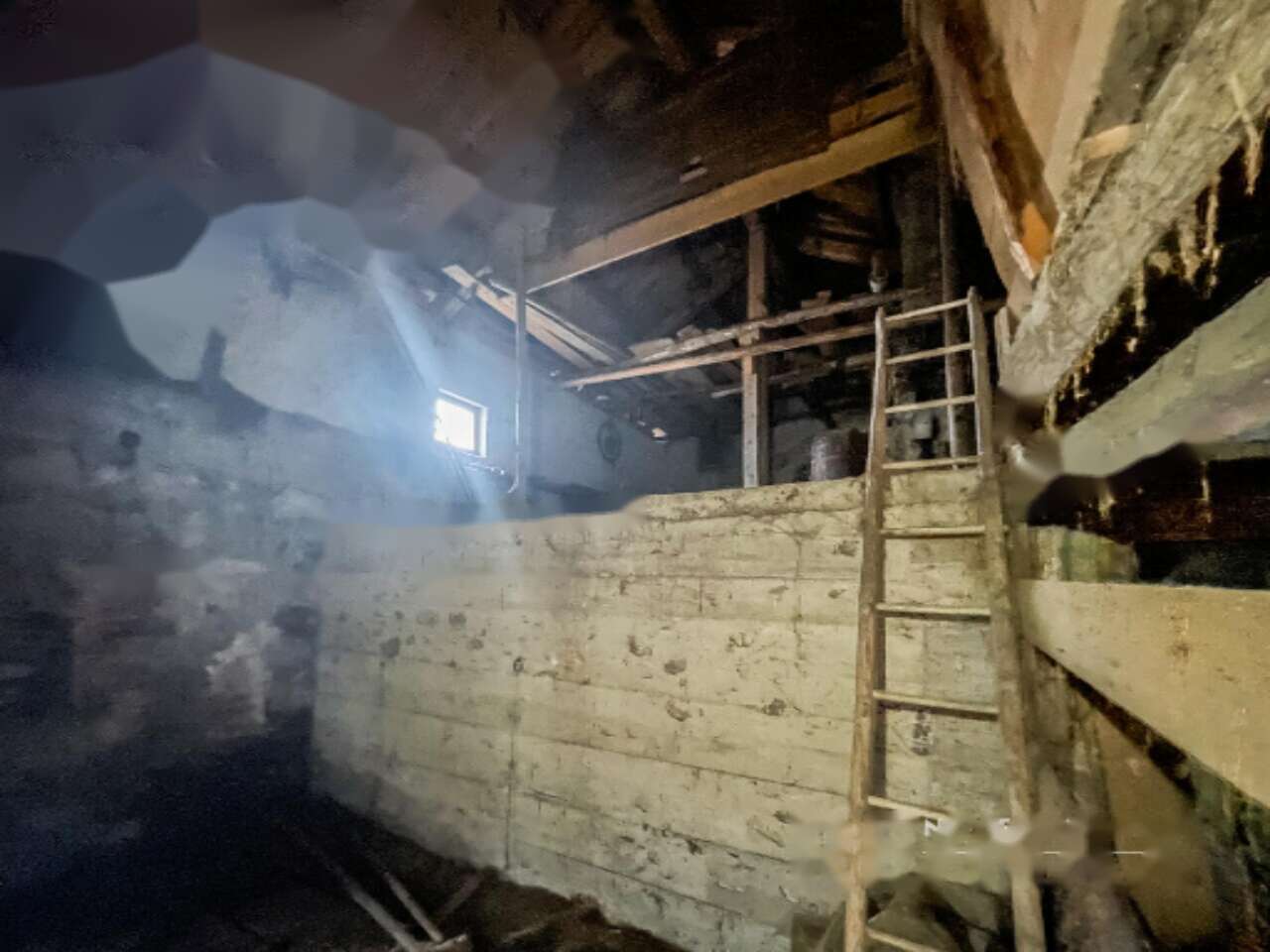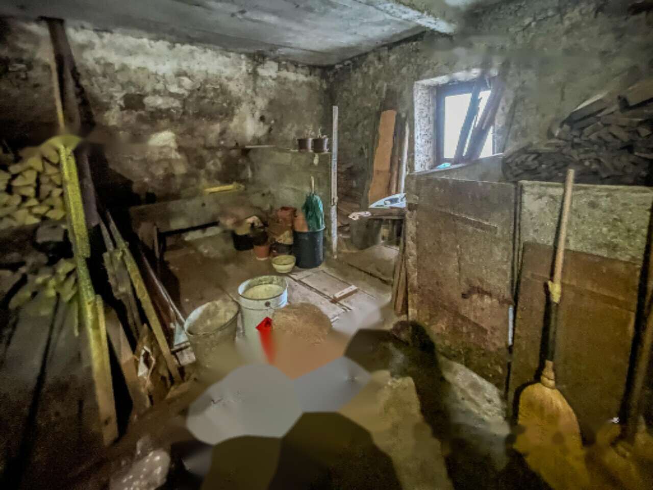 В доме есть подвал и два основных этажа. На первом этаже размещены кухня, кладовая, спальня и ванная комната, а также помещение, когда-то бывшее хлевом. На втором этаже расположены просторная спальня, дополнительная комната и обширное помещение для хранения сена. На участке также имеется отдельный каменный флигель.