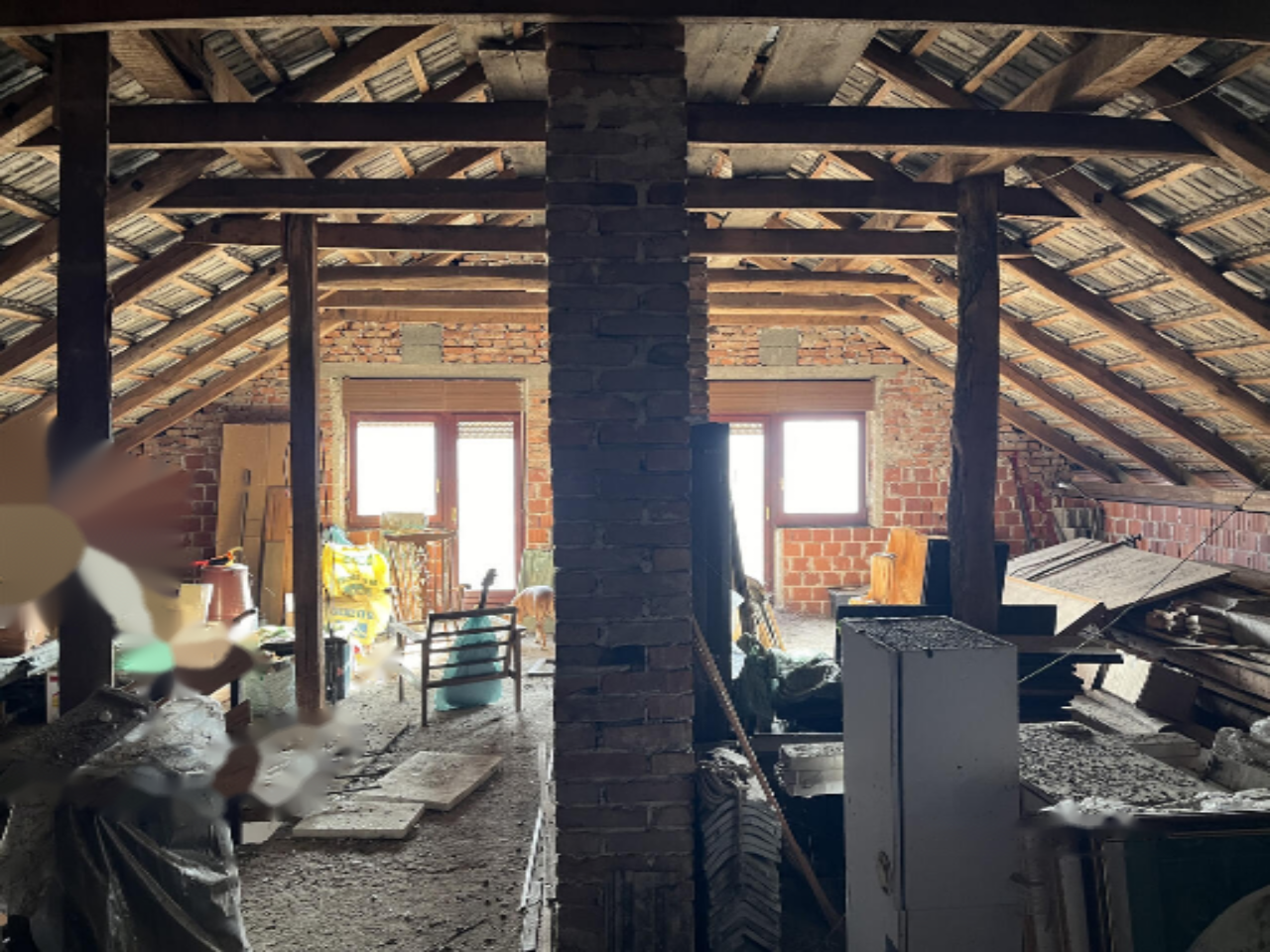 Помещения дома занимают 170 м² и включают первый этаж с подвалом, а также мансарду. На первом этаже вы найдете светлую гостиную, объединенную с кухней, одну многофункциональную комнату, которая может использоваться в качестве гаража, компактную ванную комнату с душем, унитазом и раковиной, котельную/кладовую и просторный холл. На втором этаже расположены четыре спальни, ванная комната и отдельный туалет. В одной из спален есть возможность обустроить кухню. Мансарда остаётся необорудованной, однако на ней возможна организация отдельного жилого пространства с кухней и ванной. На участке также находится хозяйственная постройка с двумя помещениями: одно служит дровяным сараем, другое – гаражом для автомобиля.