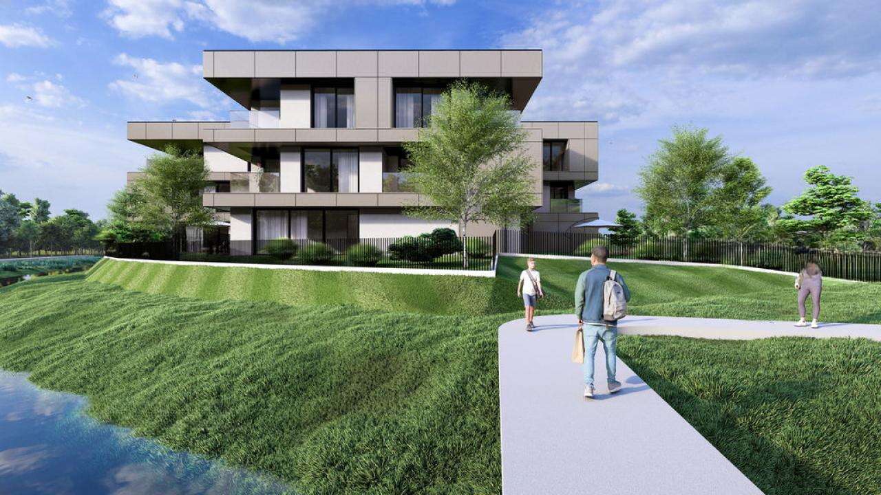 Квартира номер 25 расположена на первом этаже двухэтажного здания, оборудованного лифтом, и предлагает впечатляющие виды из обширного дневного пространства (55,98 м²), которое открывается на лоджию площадью 10,40 м². Эта площадка станет превосходным местом как для утреннего кофе, так и для встречи с друзьями или отдыха на свежем воздухе. В дополнение к квартире идут подвал (6,76 м²) и два парковочных места в гараже.
