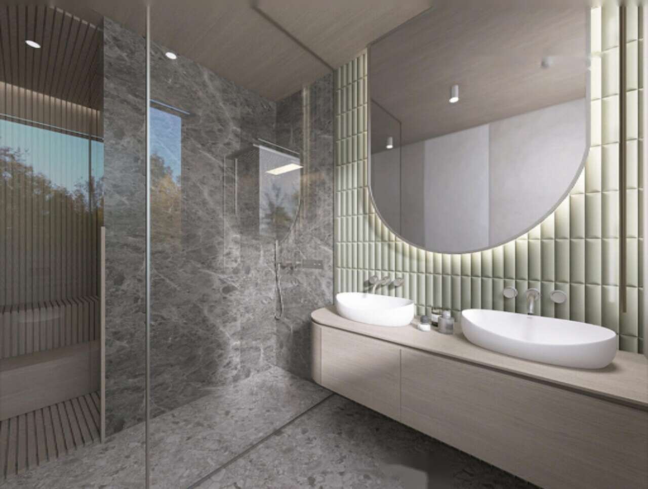 Второй этаж: главная спальня олицетворяет роскошь и включает в себя собственную ванную, сауну и гардеробную. Также здесь разместились две детские комнаты с ванной и хозяйственная зона.