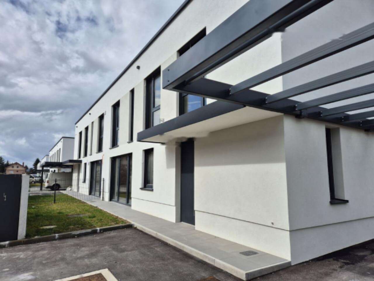 Территория вокруг дома благоустроена: имеется ухоженный сад, крытая входная зона и два навеса для автомобилей на парковке. Локация дома отличается отличным транспортным сообщением: автобусные остановки расположены всего в минуте ходьбы, поездка до центра занимает четыре минуты, а до объездной дороги — одну минуту. В непосредственной близости находятся детские сады, школы, магазины и природные достопримечательности. Река Любляница и природный парк Люблянское Барье, а также фитнес-станции, теннисные корты и детские площадки находятся неподалеку.