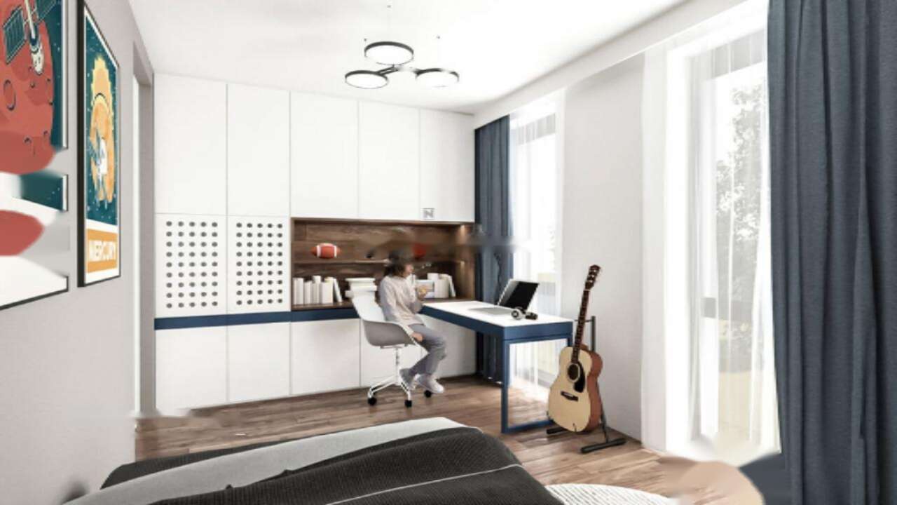 В планировке первого этажа предусмотрены просторные гостиная с обеденной зоной и кухней, прихожая, техническое помещение, рабочий кабинет и санузел. Из гостиной и столовой ведет выход на террасу. На втором этаже находятся две детские комнаты с ванной комнатой, главная спальня с отдельной ванной и гардеробной, а также кабинет для работы.
