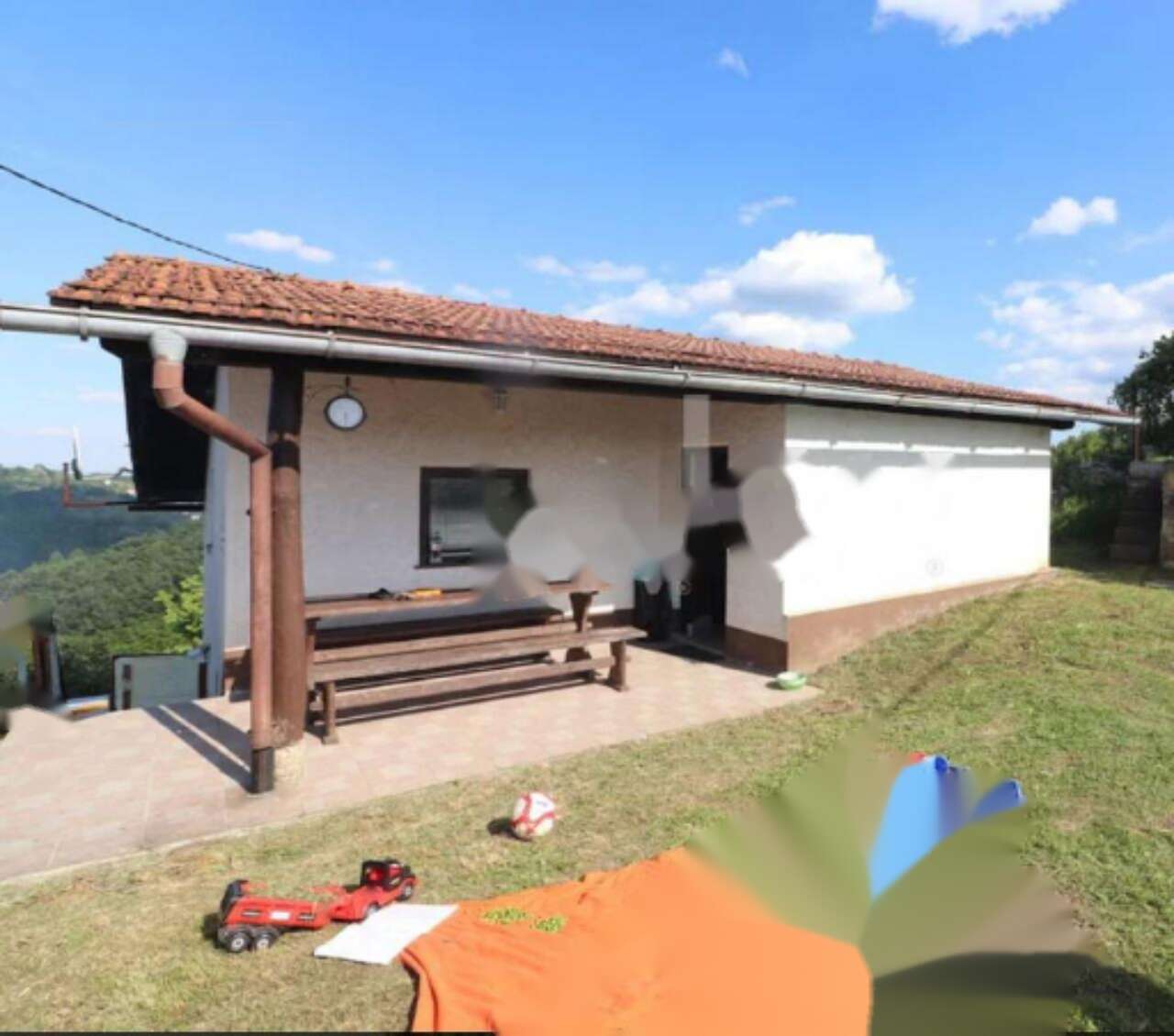 Жилая площадь составляет 78,7 м² и включает просторный вход, прихожую, кухню с обеденной зоной, ванную комнату с душевой кабиной и туалетом, одну спальню и детскую комнату. Кроме того, на территории имеется гараж, вмещающий несколько автомобилей, и обустроенная терраса.