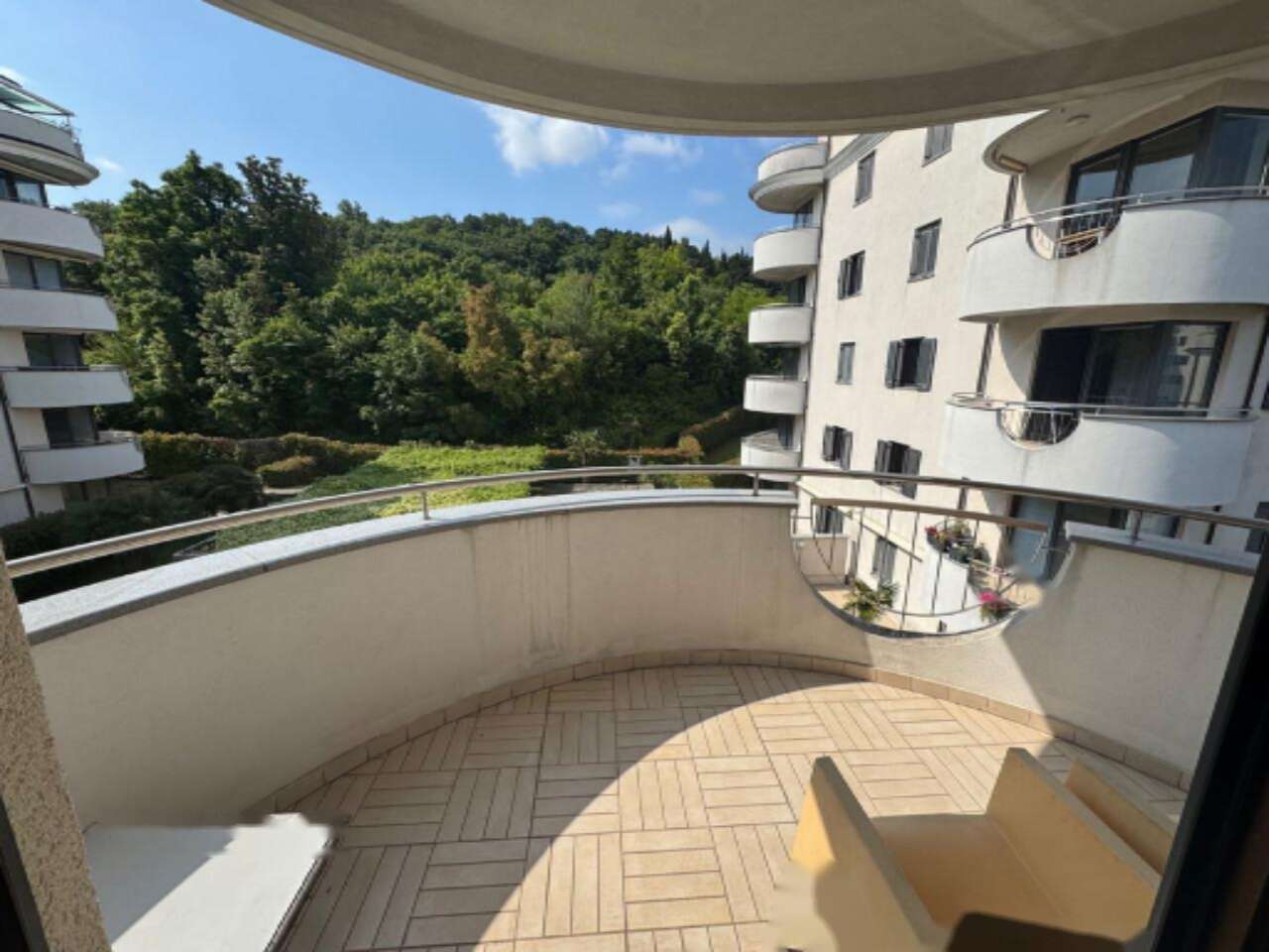 Предлагается на продажу элегантная двухкомнатная квартира, расположенная в охраняемом комплексе «Вила Элизия» по адресу: Резиденция Парк Луция, улица Обала 144, Порторож, Словения. Жилье находится на втором этаже, откуда открывается восхитительный вид на парк и окружающую зелень.