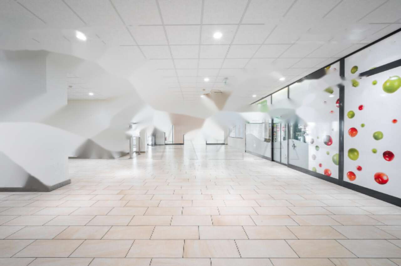 С точки зрения архитектуры, это современное пространство с панорамными окнами, обращенными на северо-запад... с великолепным видом на реку Любляницу. Витрины временно скрыты гипсокартоном, который при необходимости можно легко убрать.