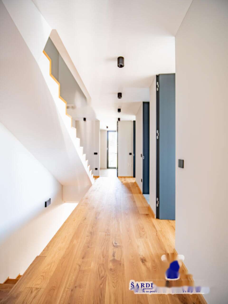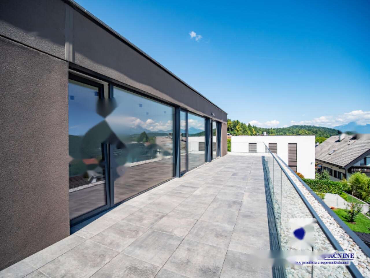 Площадь квартиры составляет 239,9 м², включая 145,6 м² полезной площади (112,9 м² жилой и 32,7 м² кладовой) и две обширные террасы площадью 93,7 м² с живописным видом на окрестности. В доме применены современные экологически чистые технологии: геотермальный тепловой насос, система рекуперации воздуха и биологическая очистка сточных вод, обеспечивая высокий уровень комфорта. Уникальными особенностями являются панорамные окна с тройным остеклением, электрически регулируемые жалюзи, усиленные двери с защитой от вторжения и отпечатка пальца, фасад Jubizol, а также высококачественная внутренняя отделка из керамики и паркета.