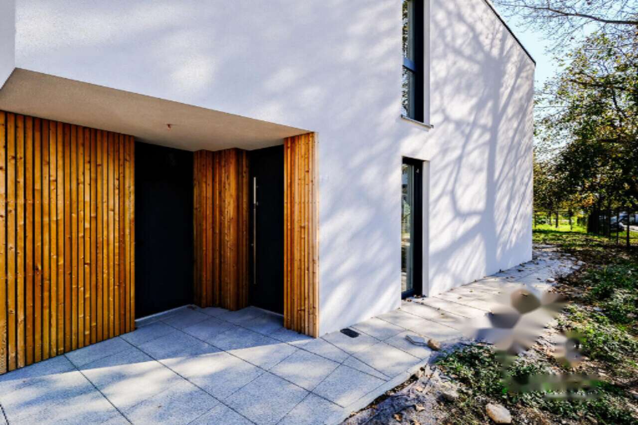Перед домом находится парковка, рассчитанная на два-три автомобиля, с возможностью установки навеса. Для отделки использованы тонкослойная штукатурка светло-серого цвета и облицовка из лиственничных реек. На первом этаже установлены большие панорамные окна, а также прямоугольные ПВХ окна с наружной окантовкой тёмно-серого цвета. Входную дверь оснащают системой распознавания отпечатков пальцев.