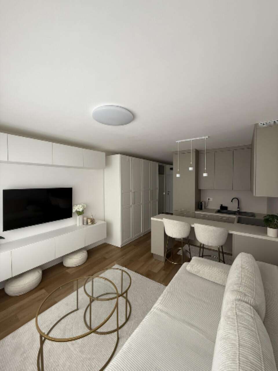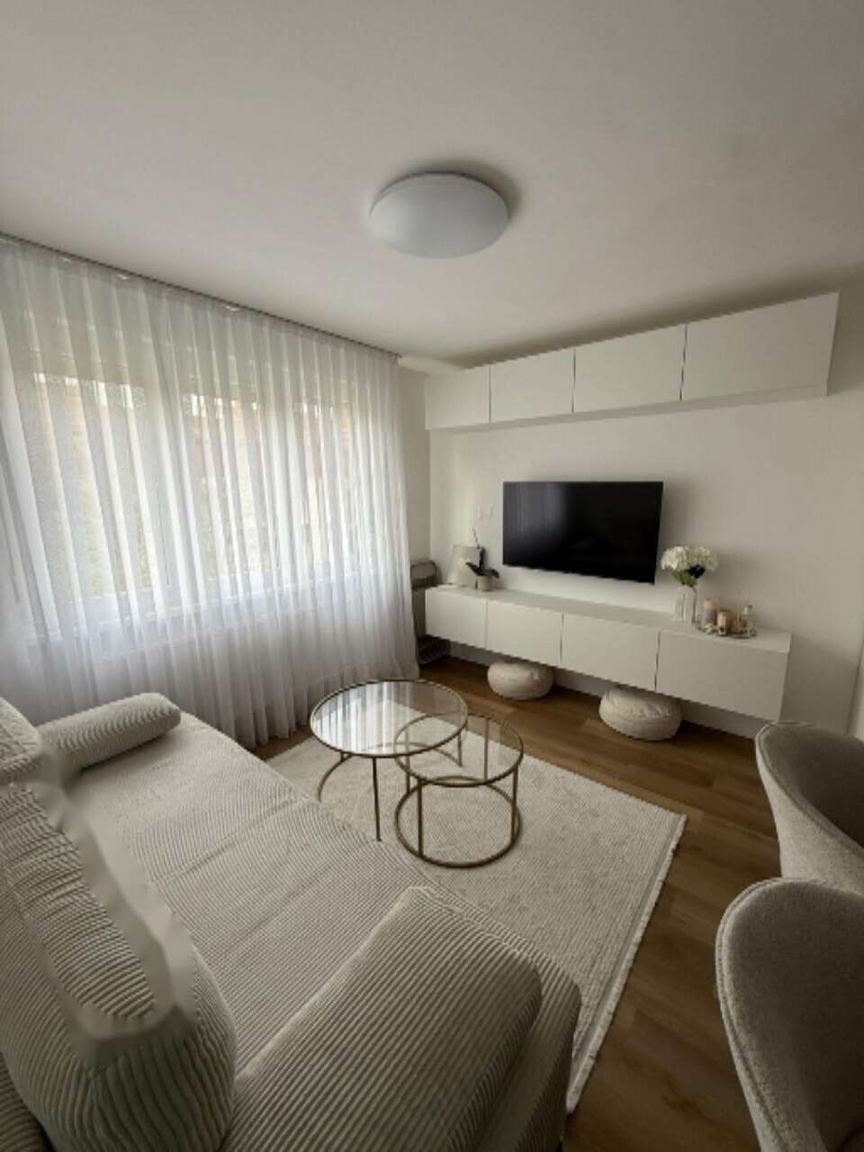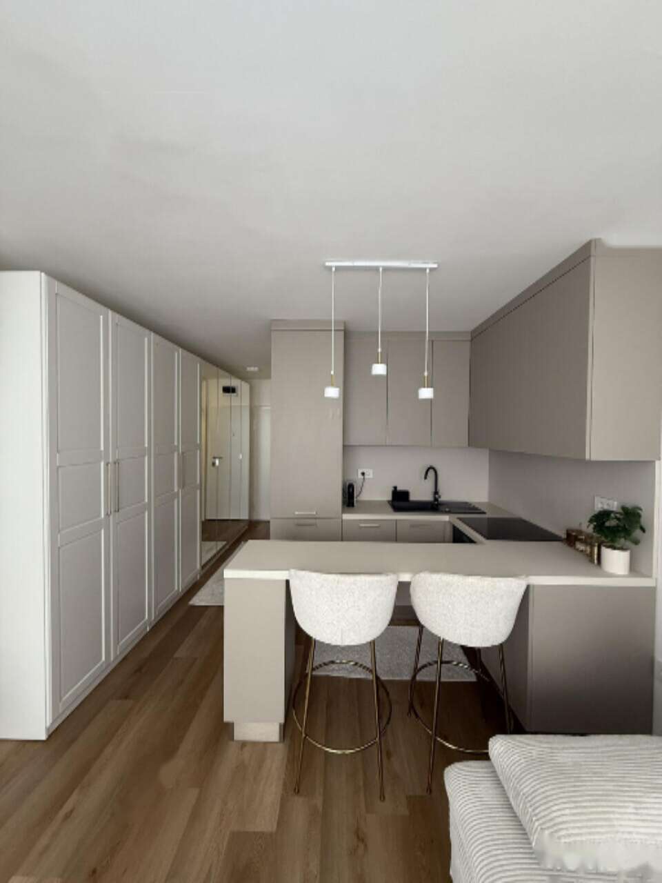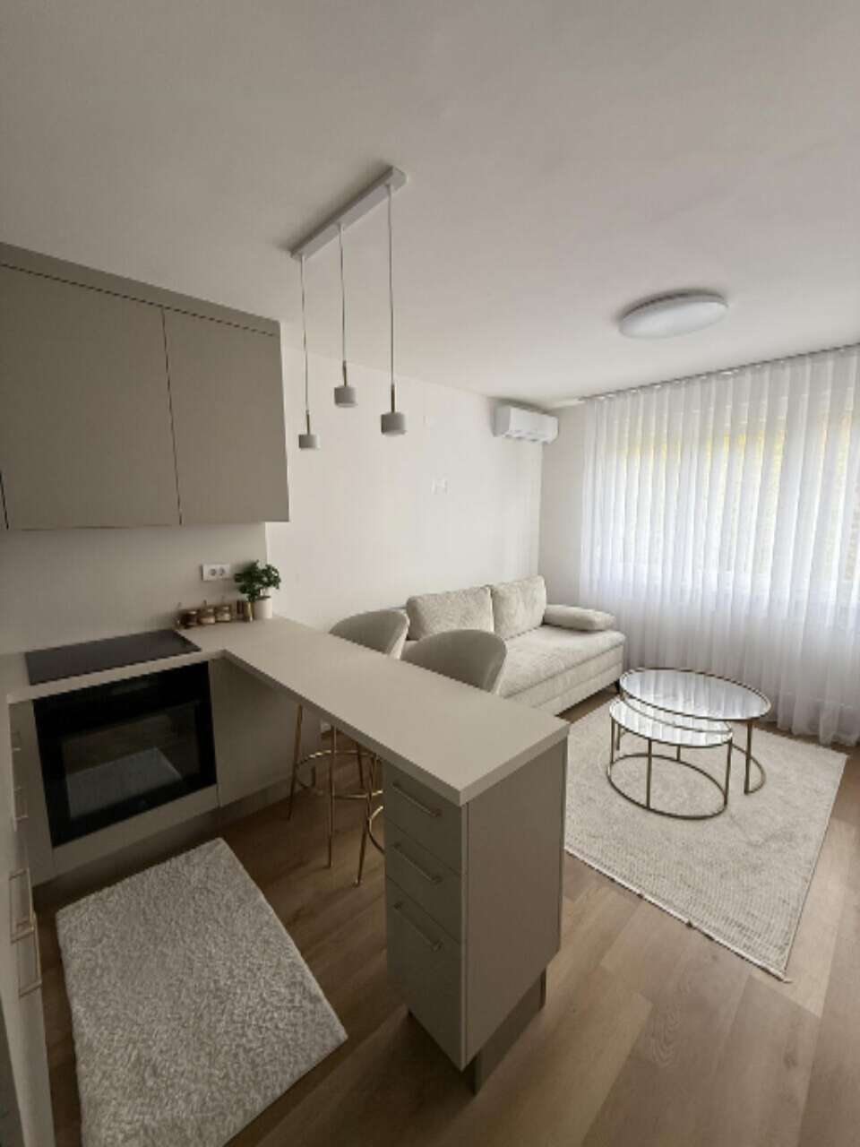 Предлагается для покупки светлая и целиком обновленная в 2025 году квартира-студия, расположенная на третьем этаже из четырех в районе Фужине. Жилая площадь составляет 32,45 м², и продуманный дизайн дополняется кладовой в 5 м². Система отопления реализована через центральное теплоснабжение, а в жаркое время года охлаждение обеспечивает кондиционер.