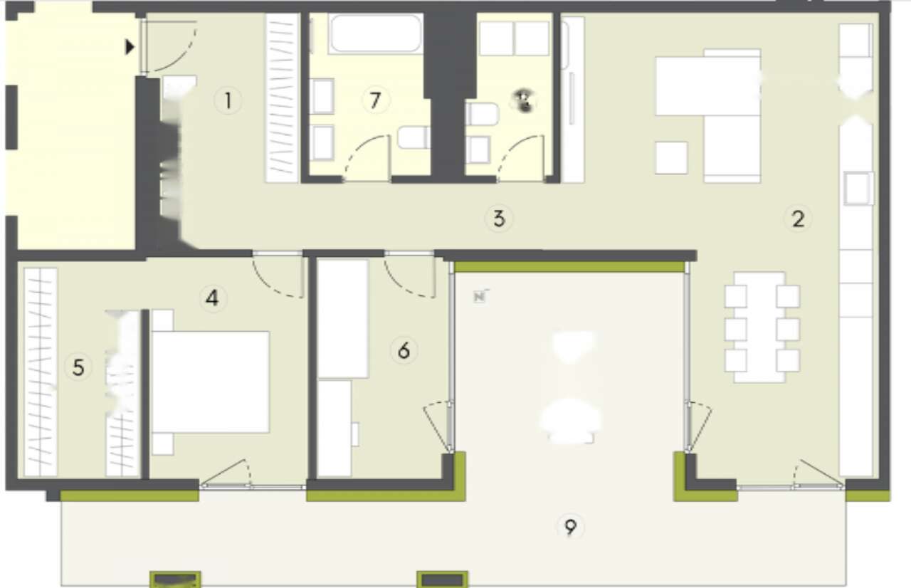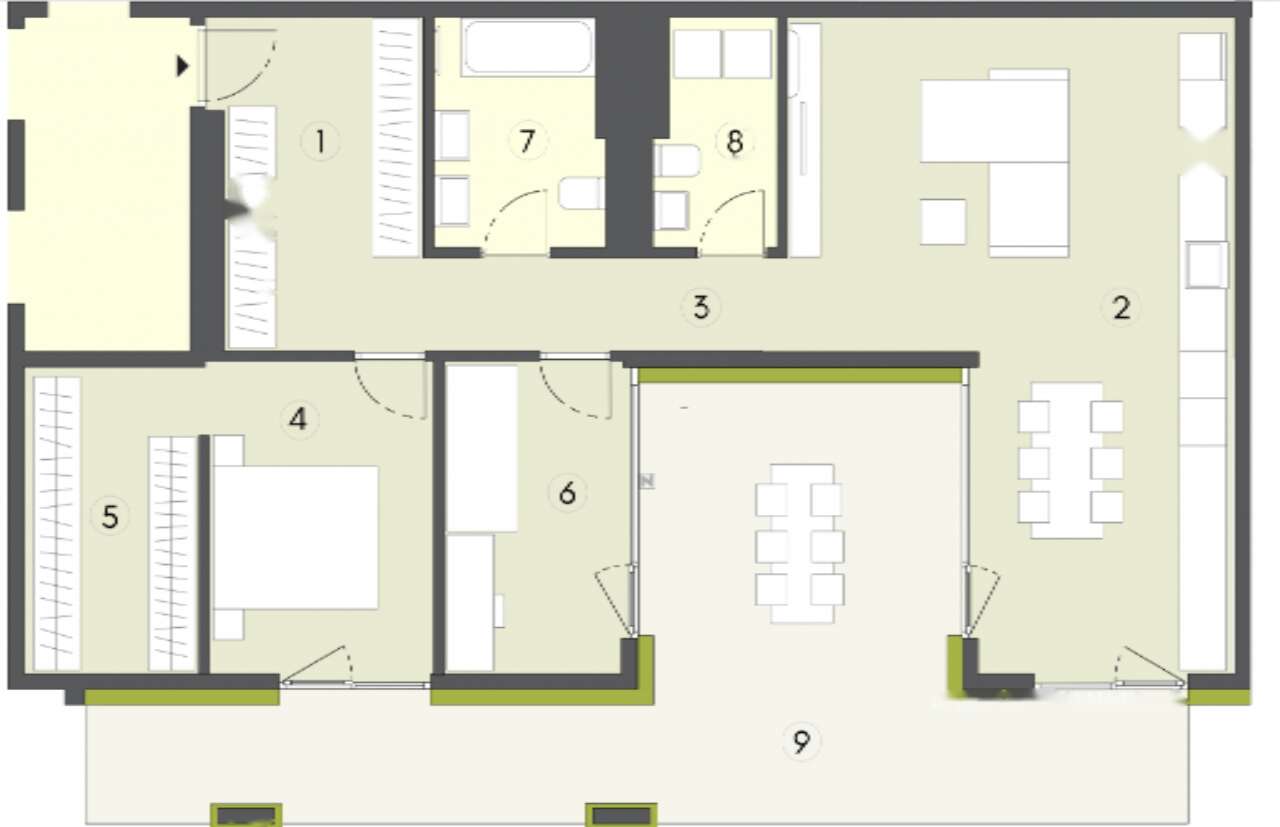 Квартира пленяет современными архитектурными решениями и высокими стандартами энергоэффективности. Большие стеклянные окна соединяют внутренние и внешние пространства, создавая светлый и комфортабельный дом. Планировка включает уютную прихожую, просторную гостиную, кухню, две спальни, ванную комнату, отдельный туалет, хозяйственное помещение и кабинет. Из гостиной расположен выход на западную террасу размером 35,4 м², которая наполняет пространство светом и уютом.