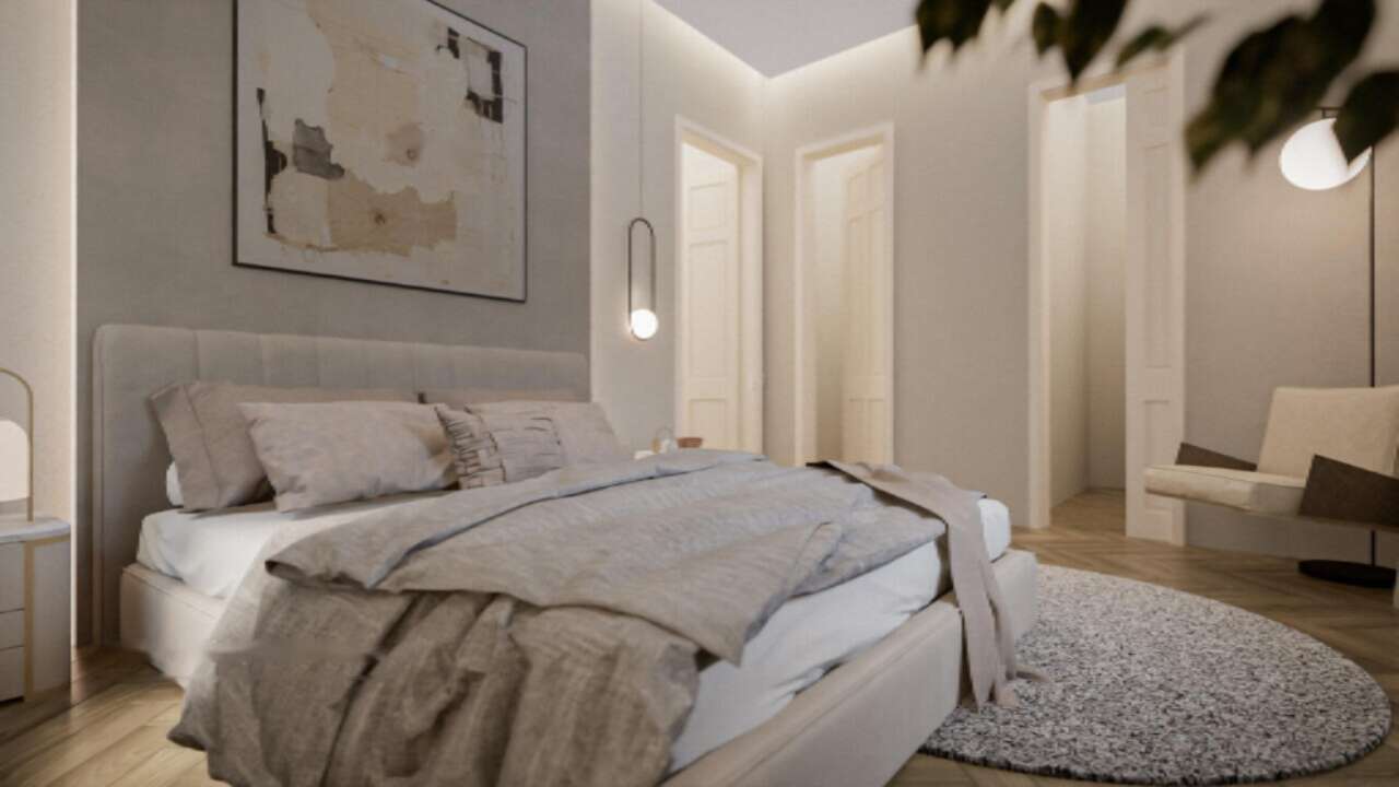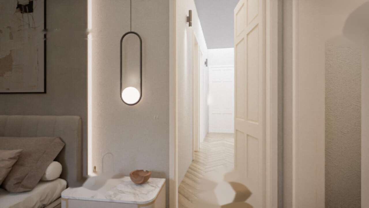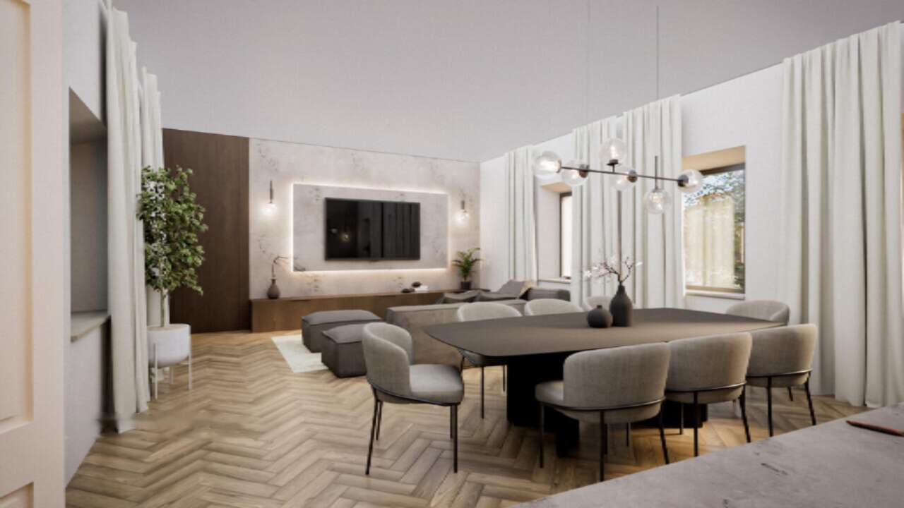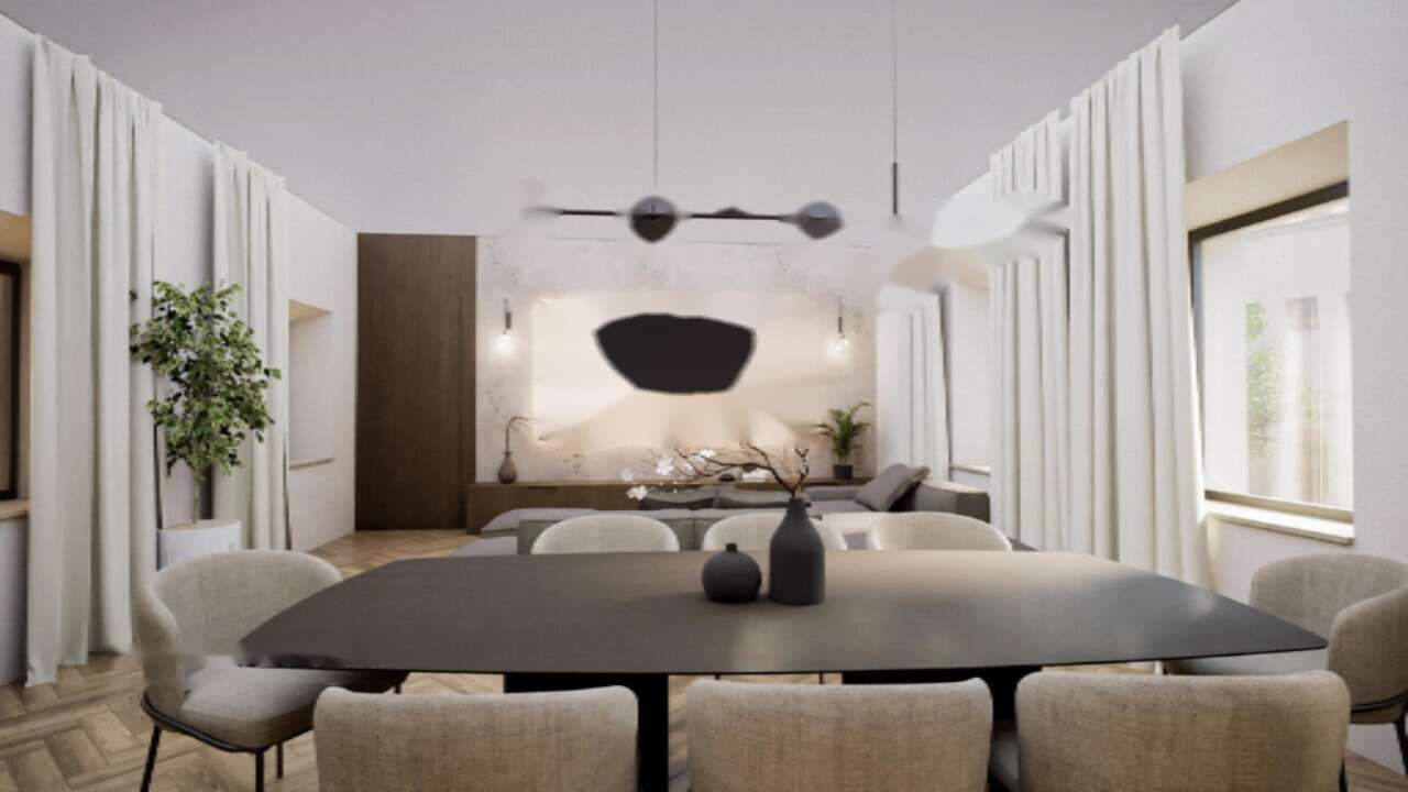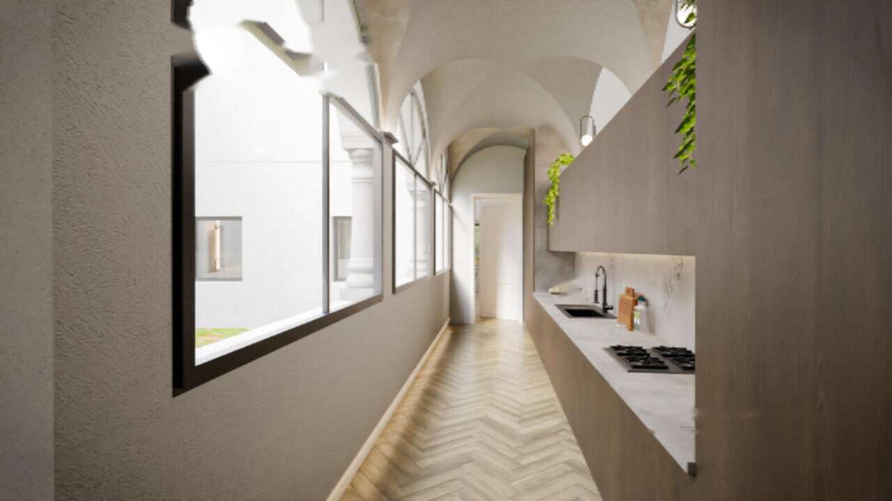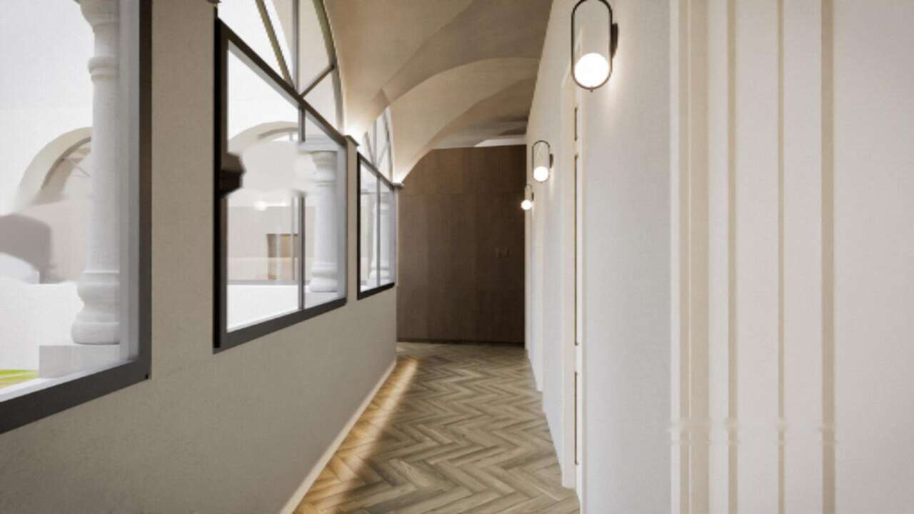 Общий метраж составляет 160,6 м² и позволяет полностью персонализировать интерьер, выбирая, например, напольные покрытия. Планировка гибкая и адаптивная: можно использовать пространство как единое жилище или разделить на две самостоятельные квартиры. Внутренний стеклянный атриум оформлен новыми деревянными окнами. Пространство вокруг атриума, украшенное арочными коридорами с каменными колоннами и акцентной подсветкой, плавно переходит в жилую зону, делая её светлой и просторной.