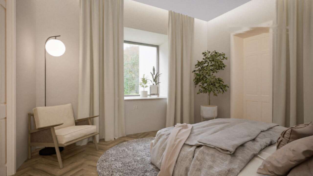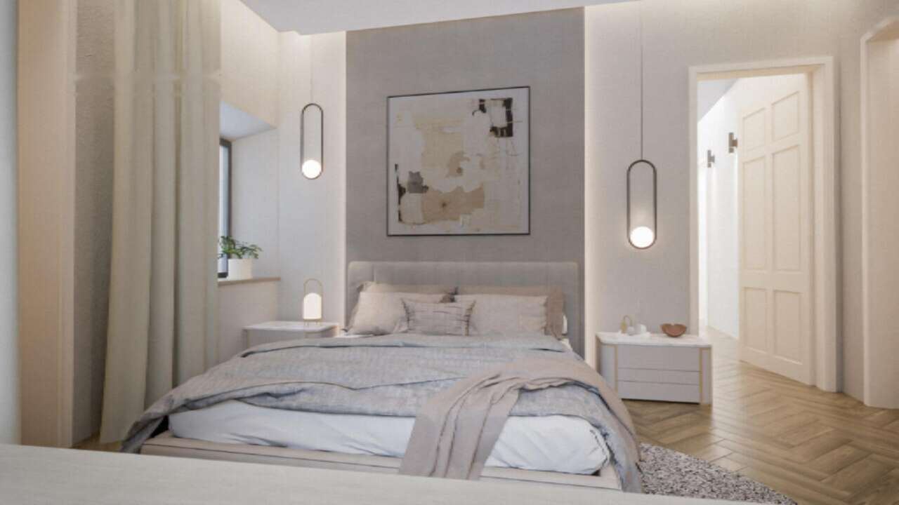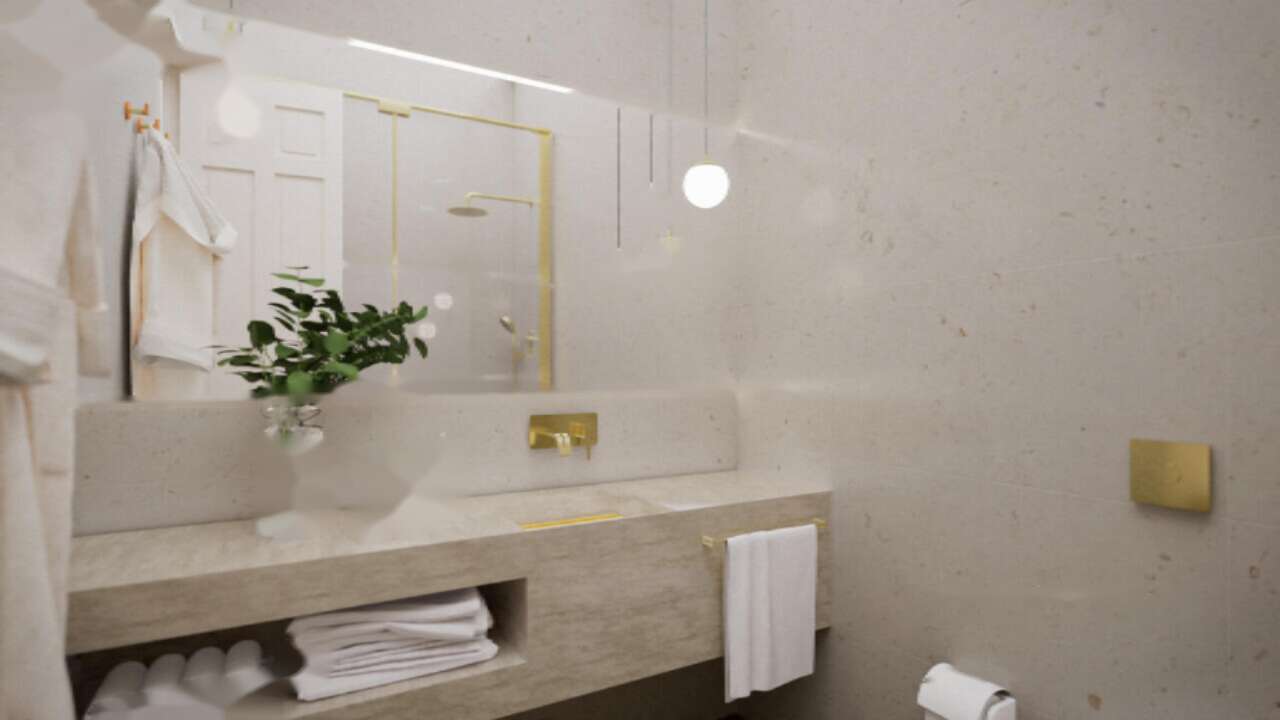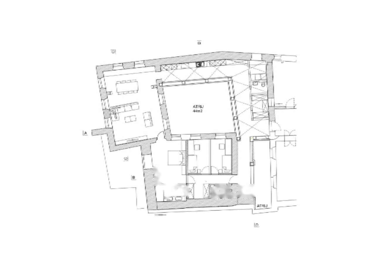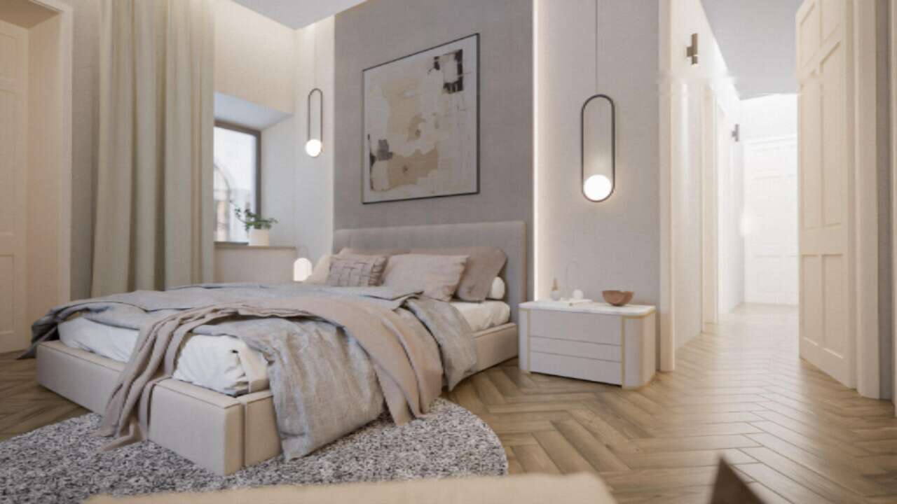 Общий метраж составляет 160,6 м² и позволяет полностью персонализировать интерьер, выбирая, например, напольные покрытия. Планировка гибкая и адаптивная: можно использовать пространство как единое жилище или разделить на две самостоятельные квартиры. Внутренний стеклянный атриум оформлен новыми деревянными окнами. Пространство вокруг атриума, украшенное арочными коридорами с каменными колоннами и акцентной подсветкой, плавно переходит в жилую зону, делая её светлой и просторной.