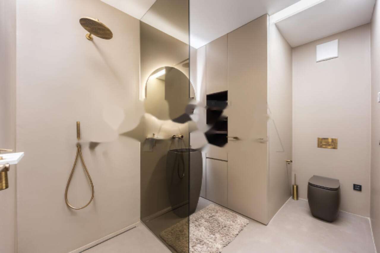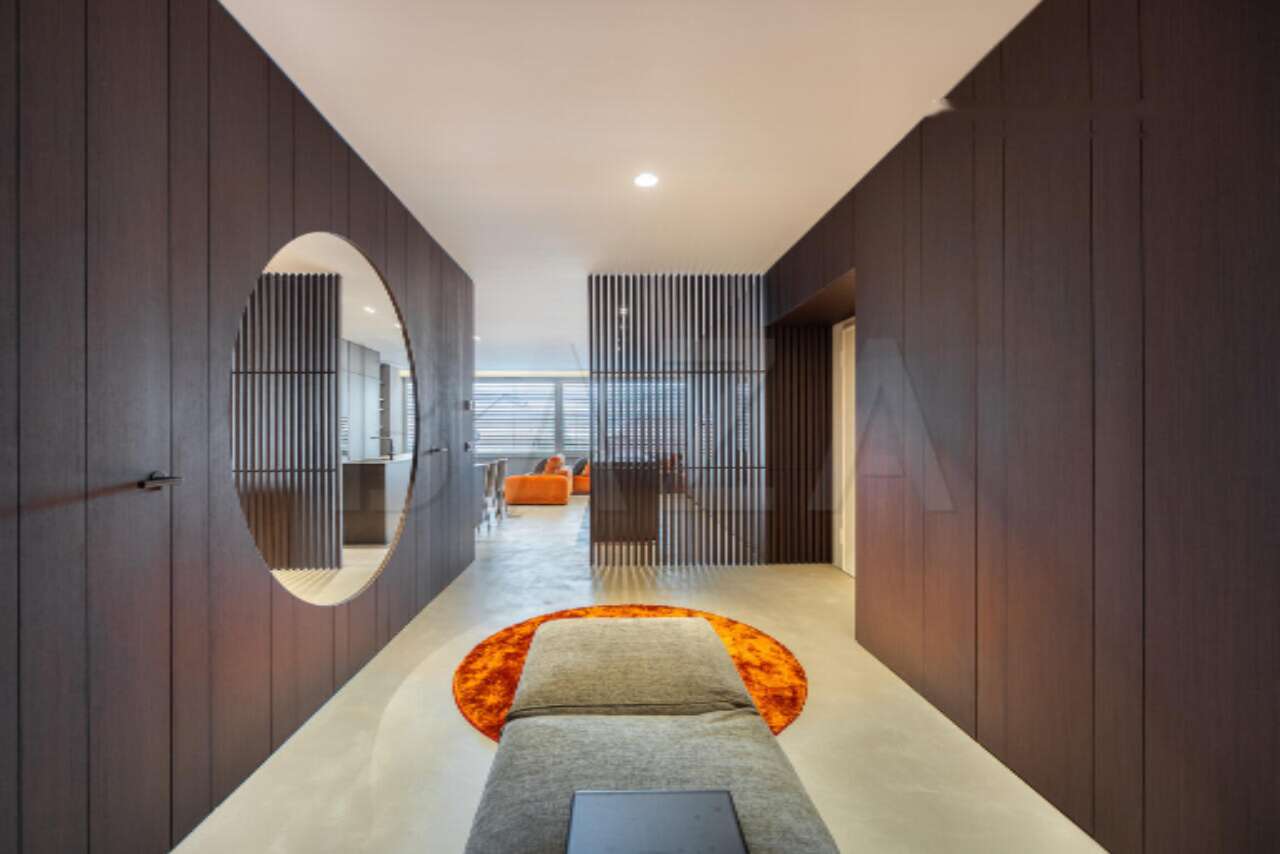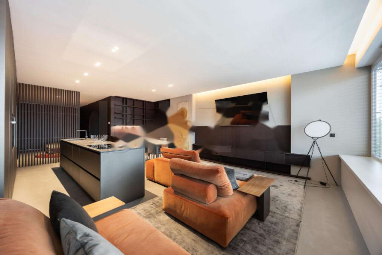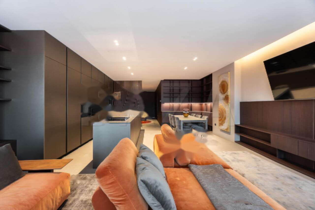 Квартира привлекает уникальным современным дизайном, который гармонично объединяет изысканную эстетику и практичность. Просторная гостиная с кухней и столовой зоной создает идеальную атмосферу для приятного проживания. Интерьер обустроен высококачественной мебелью на заказ.