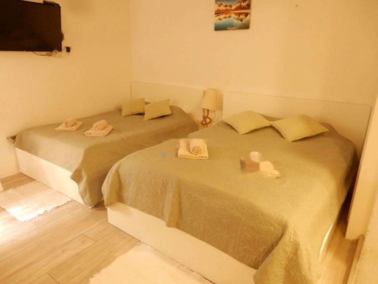 Пятиэтажное здание прошло полную модернизацию в 2020 году, включая замену электропроводки, коммуникаций, фасадных конструкций, окон, а также утепление крыши. Интерьеры дома светлые и просторные, в них разместились восемь спален, каждая с собственной ванной комнатой, кондиционером и телевизором. На первом этаже расположен уютный апартамент на четыре спальных места с кухней и санузлом. Вторая и третья секции здания включают шесть комнат с ванными, а на мансарде имеется еще одна комната с выходом на террасу, откуда открывается завораживающий вид на Пиран.