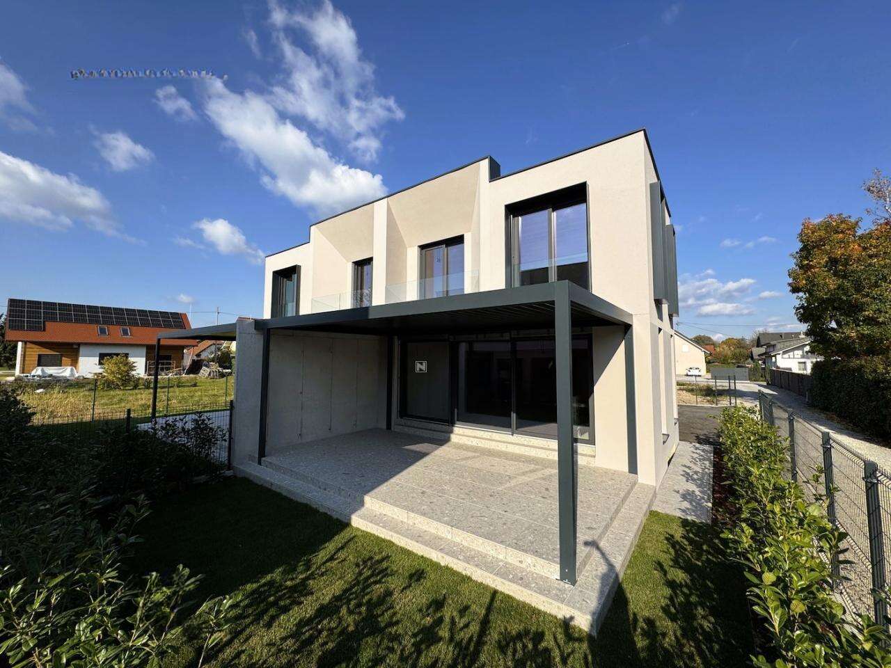 Жилые комнаты спроектированы с юго-западной стороны, что способствует отличному естественному освещению через большие окна. Вокруг дома разбит ухоженный сад с травянистыми участками и кустарниками, установлена система полива. Также имеется крытая терраса с биоклиматической перголой и современная плитка на регулируемых основаниях.
