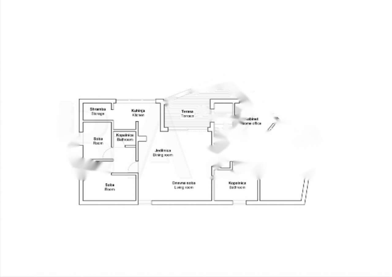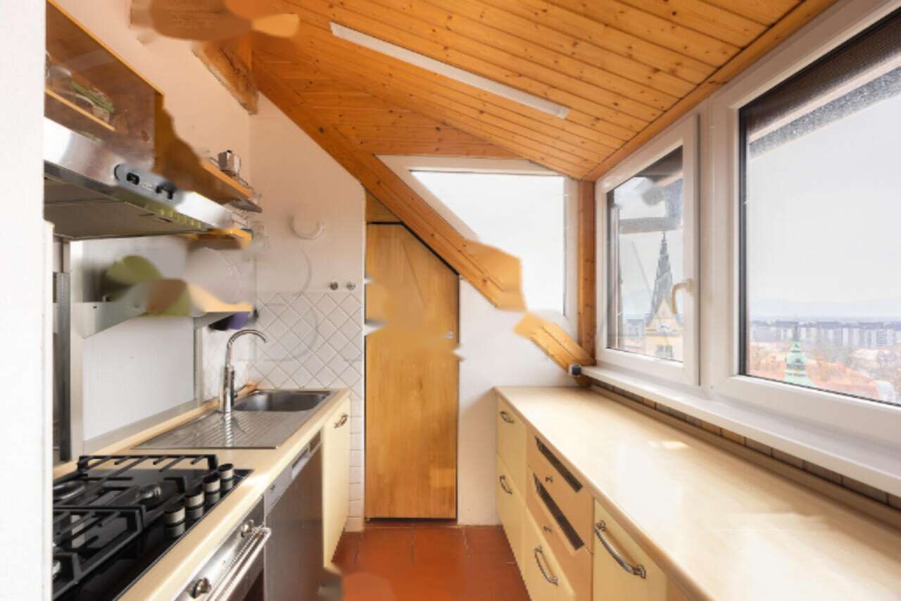 На площади в 132 м² раскинулась просторная квартира, занимающая весь верхний этаж с окнами, выходящими на все стороны горизонта, открывающая прекрасные виды на Любляну. Планировка включает лестницу с прихожей, рабочий кабинет, удобную главную спальню с ванной, две детские комнаты, также с ванной, функциональную кухню с кладовой, просторную гостиную с камином и балконом, ориентированным на запад. Над гостиной балконные галереи служат игровой площадкой и потолочной кладовой. Также в распоряжении владельцев подсобное помещение на первом этаже и кладовая в подвале.