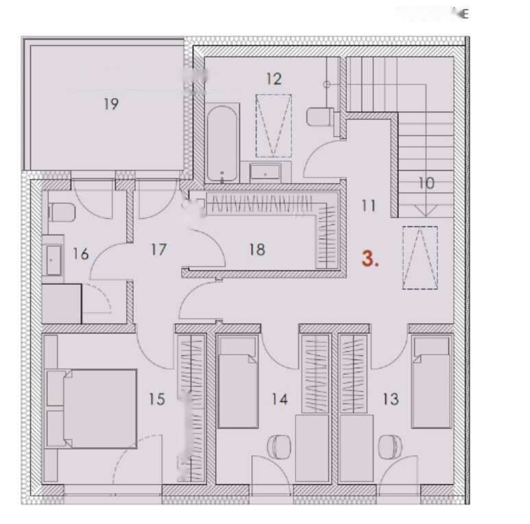 Благодаря тщательной архитектурной проработке создан оптимальный план: на нижнем этаже находится обширная гостиная с кухней и столовой, кладовая, отдельный санузел и широкая терраса. Наверху размещаются три спальни, две ванные комнаты, гардеробная и другая терраса.