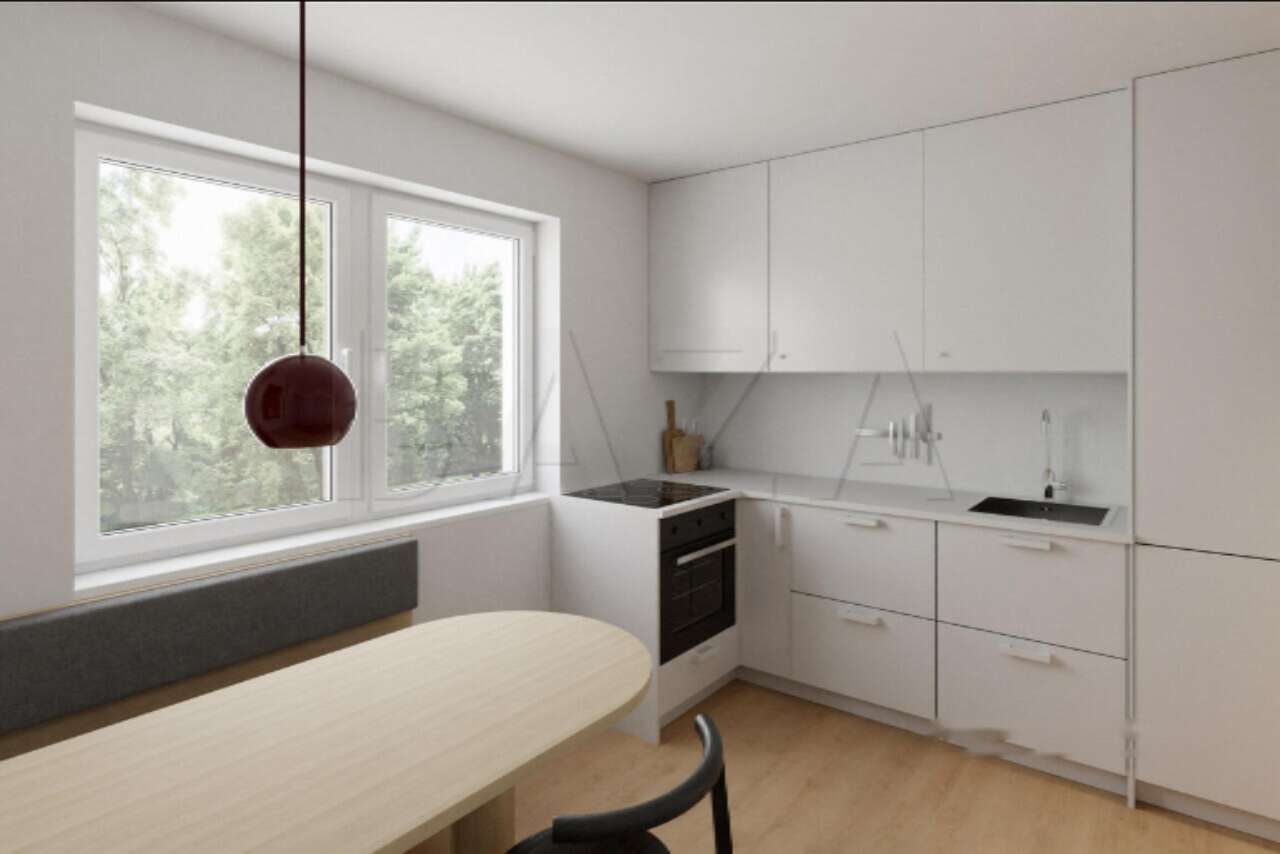 В квартире функционально расположены прихожая, кухня с обеденным уголком, ванная и просторная гостиная, которую можно легко переоборудовать в спальню. Также к квартире прилагается вместительное подвальное помещение на 5,4 м² и общие зоны для хранения велосипедов и сушки белья. На прилегающей территории обустроен зеленый дворик с возможностью создания личного сада для выращивания овощей и декора. Парковочные места предусмотрены у дома.