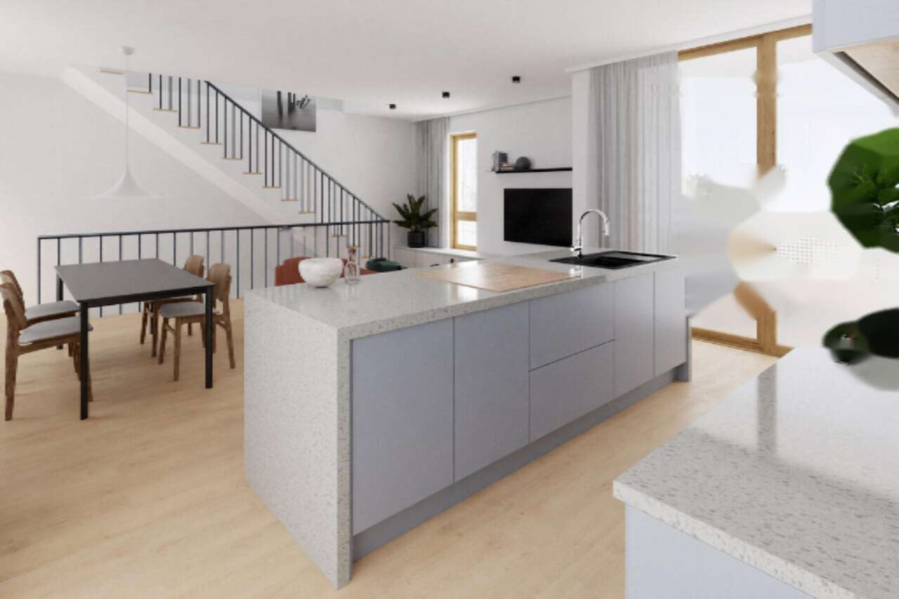 Дом построен с соблюдением высоких стандартов и доведен до третьей продленной строительной фазы, включая внешние работы. Бетонная конструкция и деревянные окна с тройным остеклением обеспечивают комфорт и энергоэффективность, а внешняя изоляция толщиной 20 см поддерживает стабильность температуры внутри. В проект входят солнечные панели, система умного управления и зарядная станция для электромобилей в гараже.
