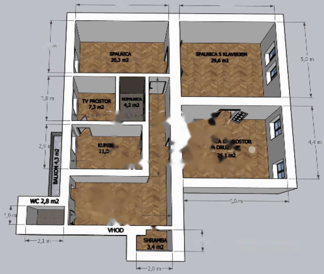 Общая площадь составляет 157,8 м², из которых 125,7 м² — это жилое пространство, 3,0 м² — кладовая, 4,1 м² занимает балкон, 8,1 м² — подвал, и 16,9 м² — чердак. Высота потолков достигает 3,1 метра.