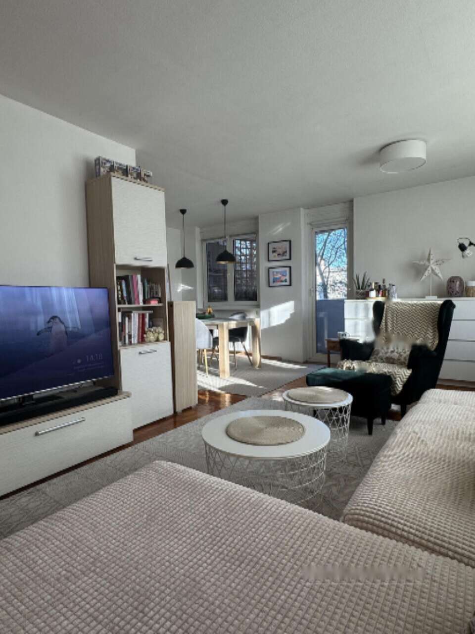 Жилая площадь квартиры составляет 68 кв.м., включая обширную гостиную, совмещенную с обеденной зоной и кухней, спальню с большим встроенным шкафом и небольшую комнату, идеально подходящую для офиса или детской. В квартире имеется одна ванная комната, отдельный туалет и два балкона: один — выходящий из гостиной, второй — маленький французский балкон из спальни.