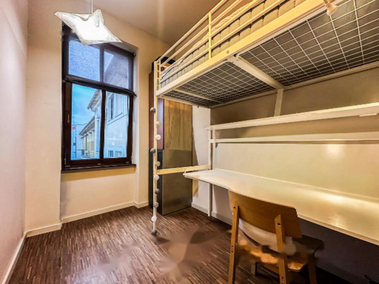 Общая площадь квартиры составляет 58,4 м², из которых 55,0 м² — полезная. Уникальность заключается в разделении двух комнат, что позволяет создать четыре функциональные и практически идентичные спальные зоны. В каждой комнате имеется кровать, шкаф и письменный стол, делая их идеальными для сдачи в аренду. Кроме того, есть отдельная кладовая площадью 3,4 м².