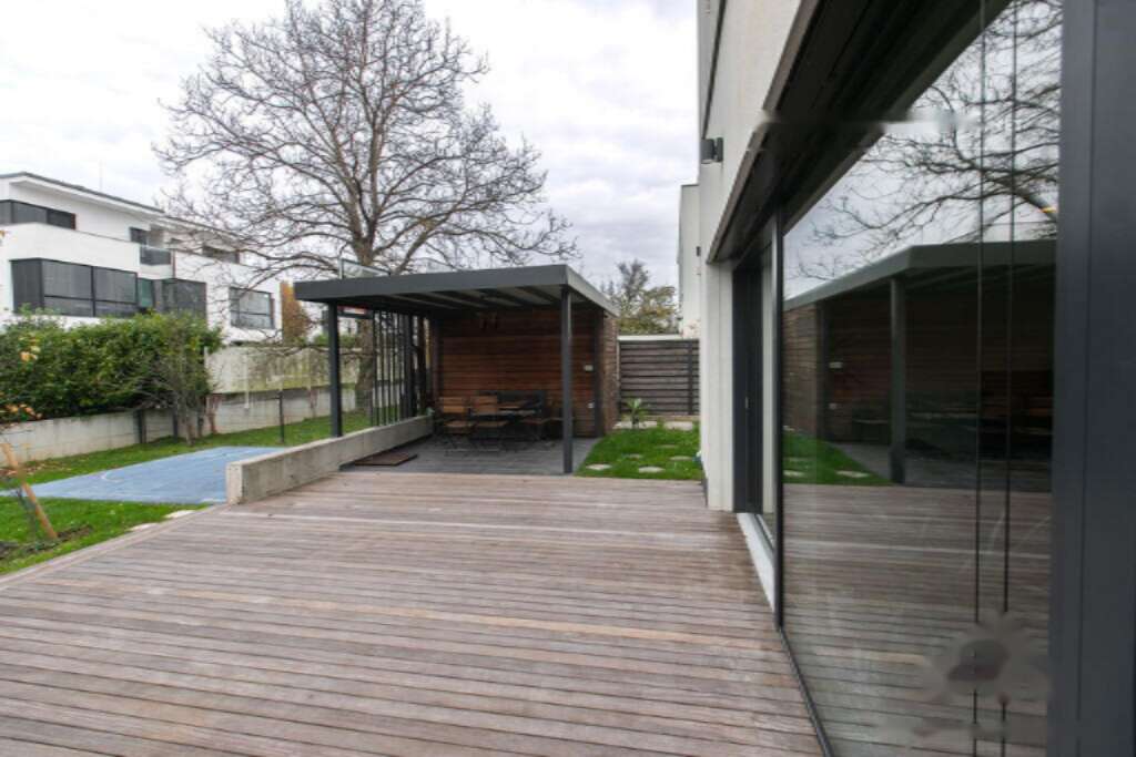 Здесь вам гарантирован максимум комфорта и уединения. Просторная гостиная, соединенная с кухней и столовой, вмещает четыре спальни, две ванные и отдельный туалет, создавая идеальные условия для семейной жизни. Насладитесь свежим воздухом и покоем на большой террасе площадью 28 м² и в саду, занимающем 232 м².