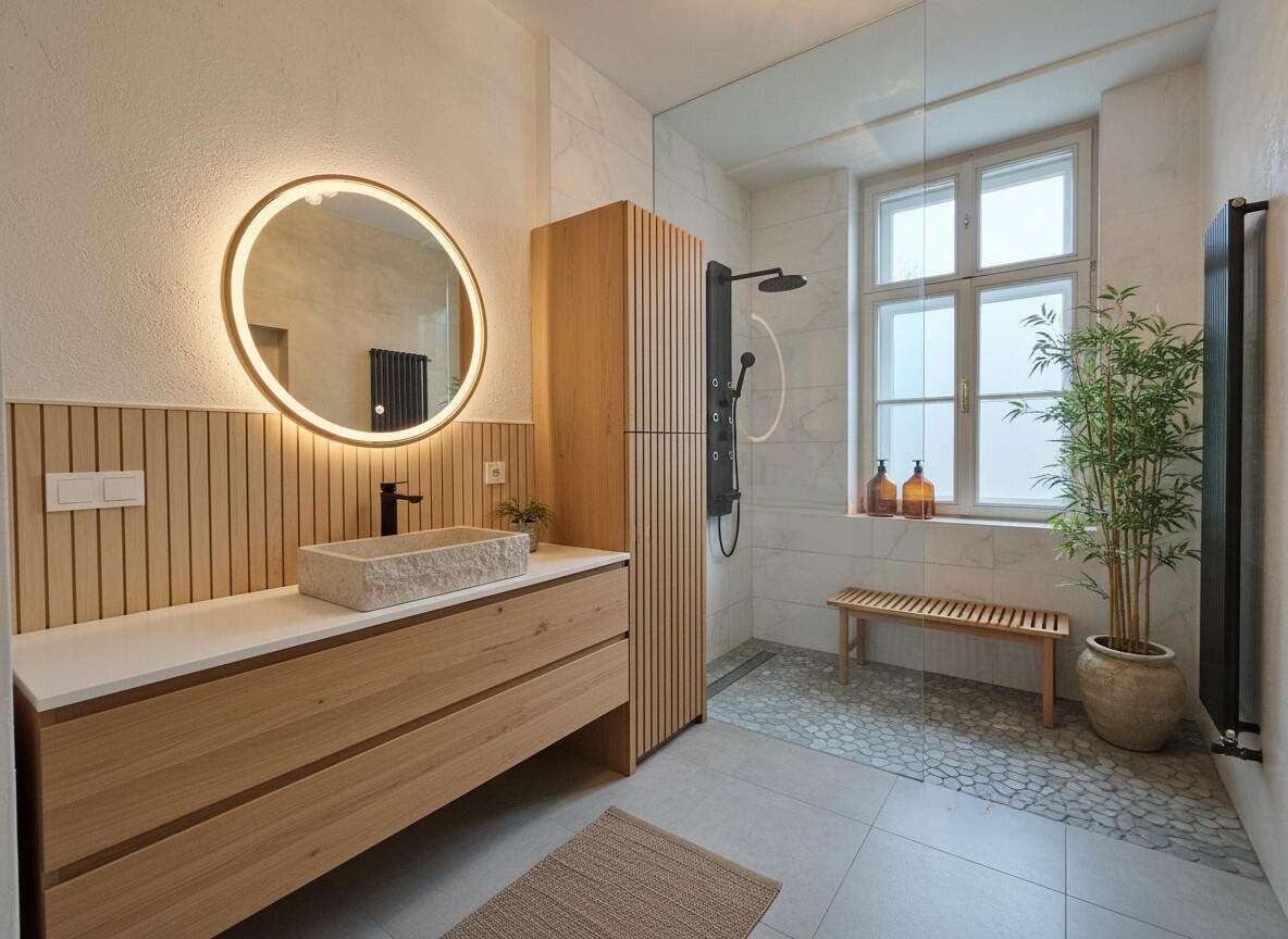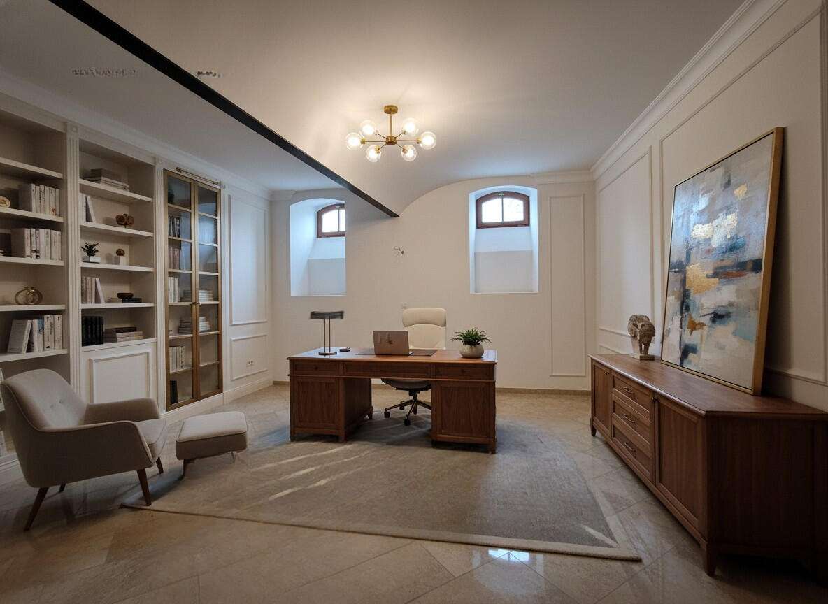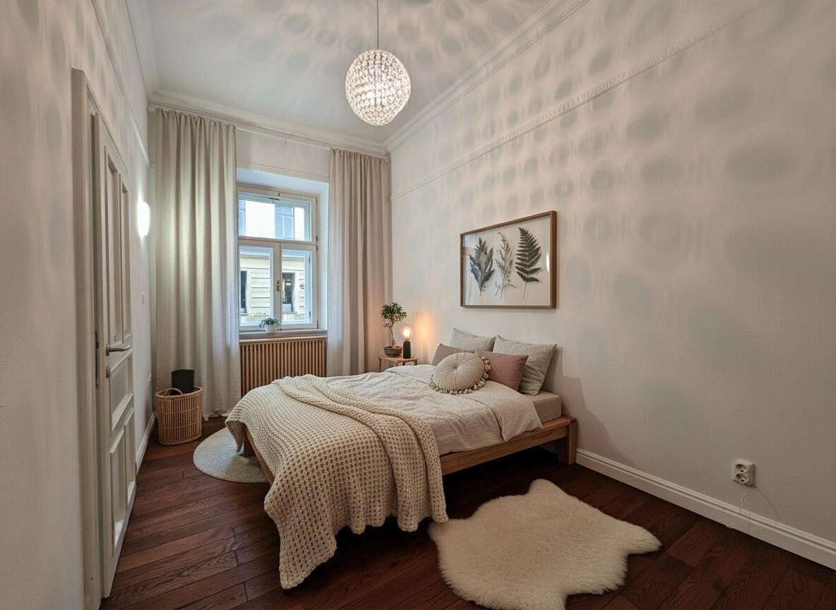 Апартаменты располагают обширной кухней с обеденной зоной, плавно переходящей в залитую светом гостиную через арочный проход. Две спальни, одна из которых выходит в подвал с обустроенным дополнительным жилым пространством. Также имеется изолированный санузел и просторная ванная. Свет заливает помещение благодаря его восточно-западной ориентации, а высокие потолки и массивные стены подчеркивают своеобразие городской архитектуры.