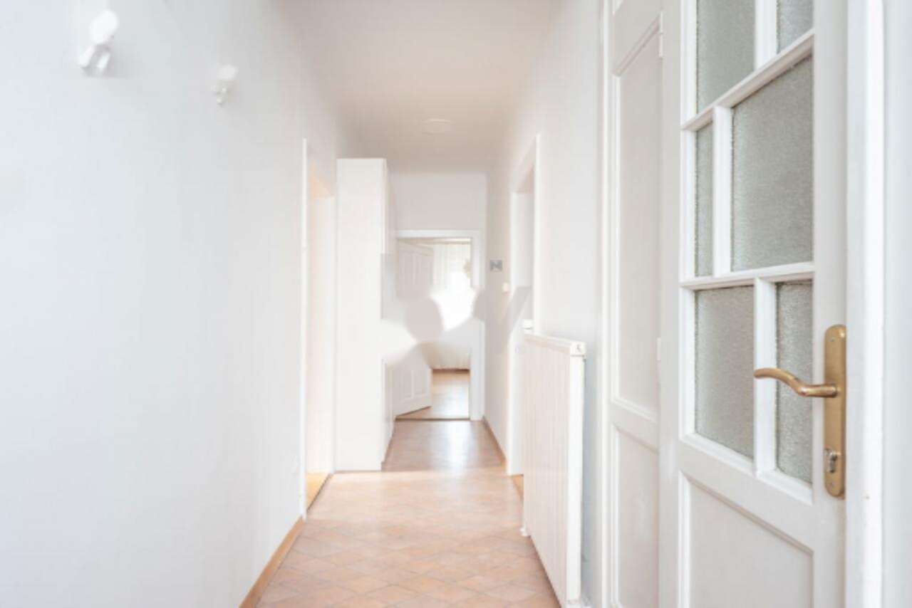 Общая площадь жилья составляет примерно 110 м², из которых 88 м² занимают комнаты на высоком первом этаже, а 22,6 м² представляет собой полезное пространство в частично утопленном подвале. Все помещения на высоком первом этаже освещаются естественным светом через большие окна, что создаёт светлую и уютную атмосферу.