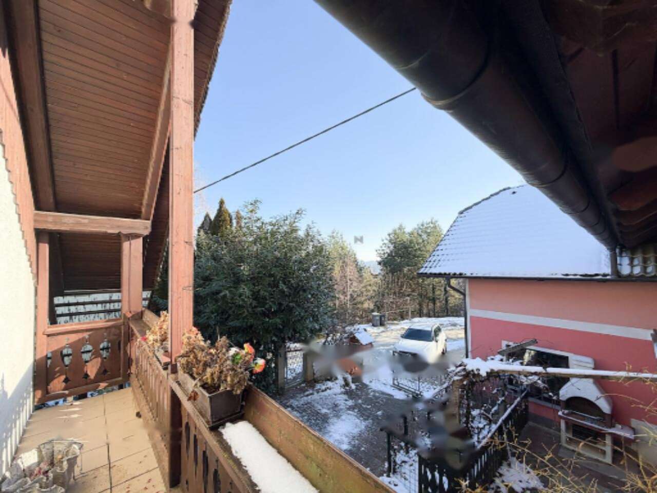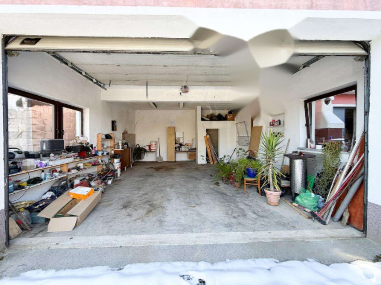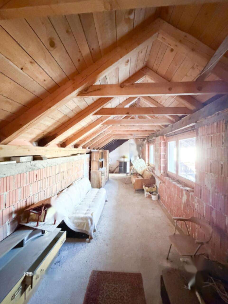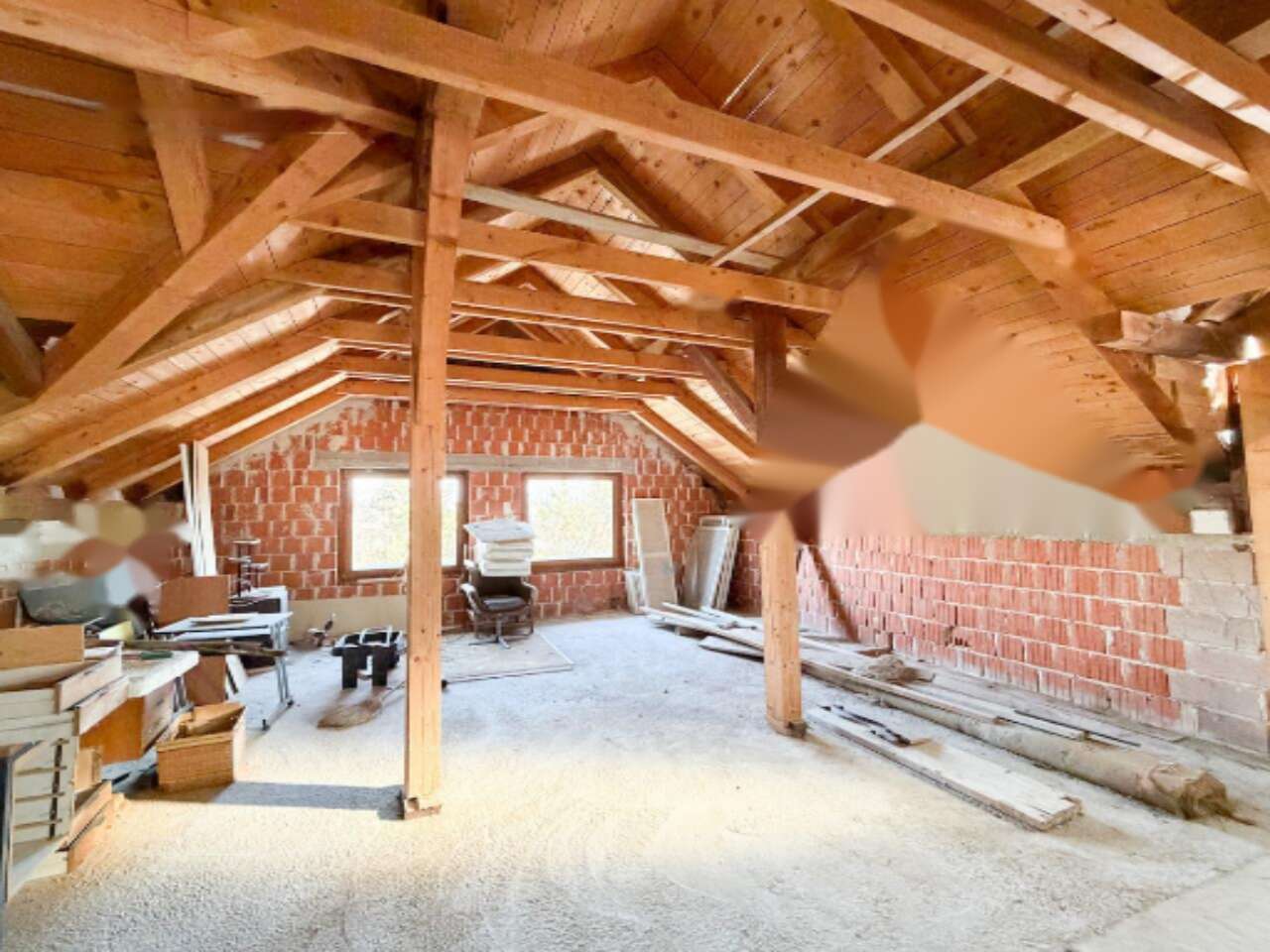 Дом предлагает два основных уровня: первый и второй, совокупная площадь которых составляет 400 м². В настоящий момент 137 м² отведены под жилое пространство, 78 м² остаются недостроенными, 50 м² занимают гаражные площади, а оставшиеся 60 м² используются для технических нужд и хранения. На территории размещены также дополнительная деревянная постройка размером 13 м² и 60 м² дровяной сарай.