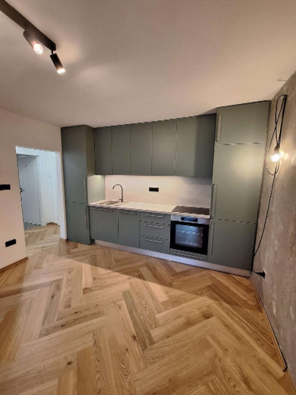 - Кухня изготовлена по индивидуальному проекту с встроенной духовкой, стеклокерамической плитой и вытяжкой.