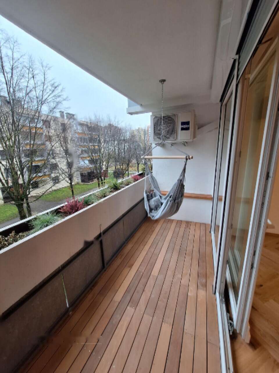 - Балкон имеет индивидуально изготовленный настил из тропического дерева.