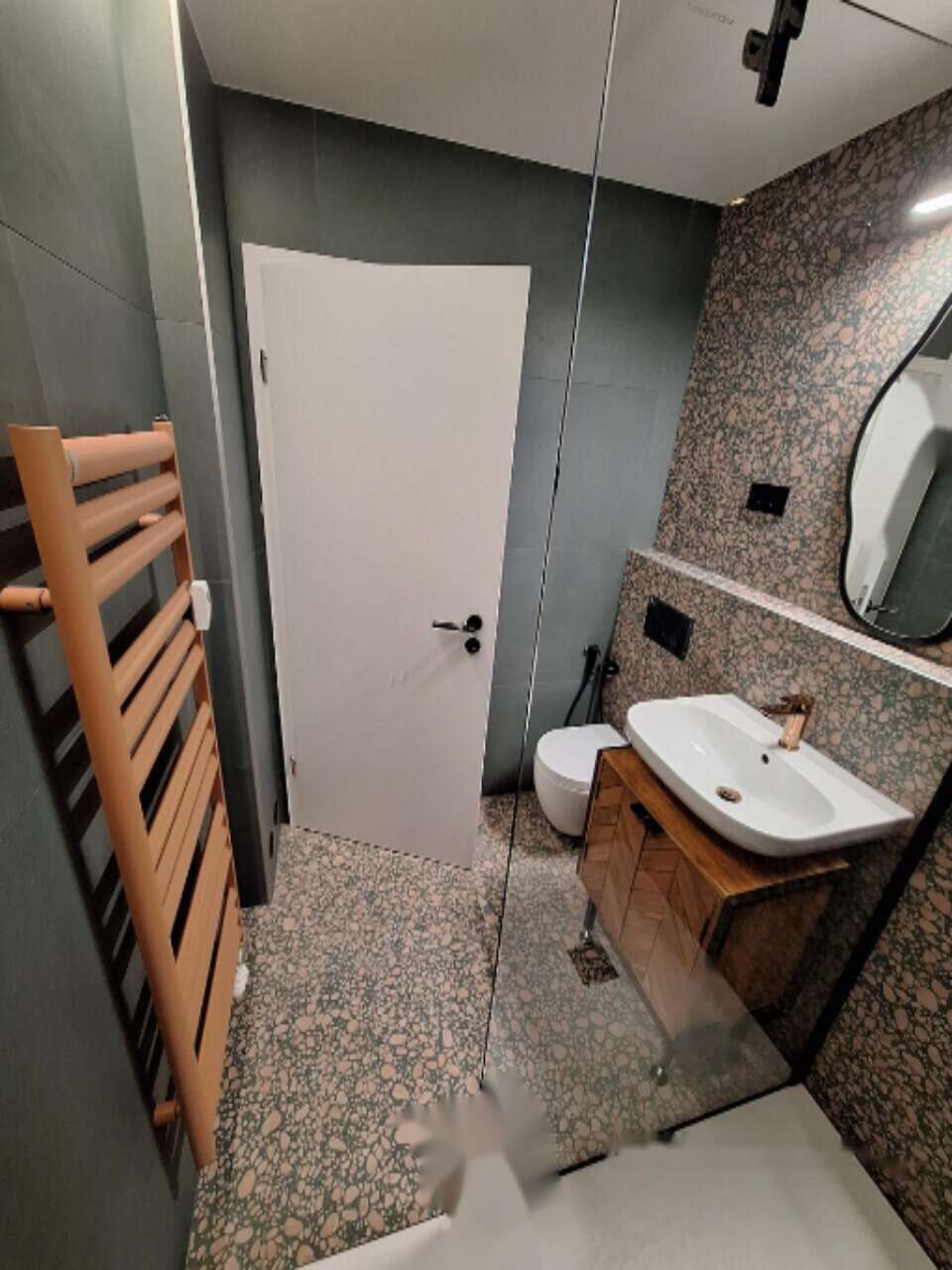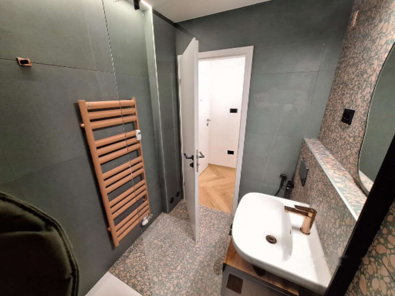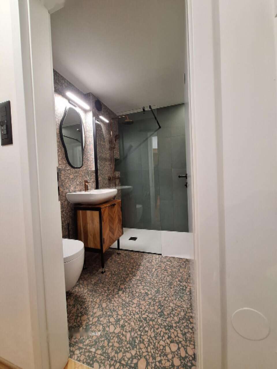 - В ванной комнате установлена просторная душевая кабина с интегрированным поддоном размером 90x160 см.