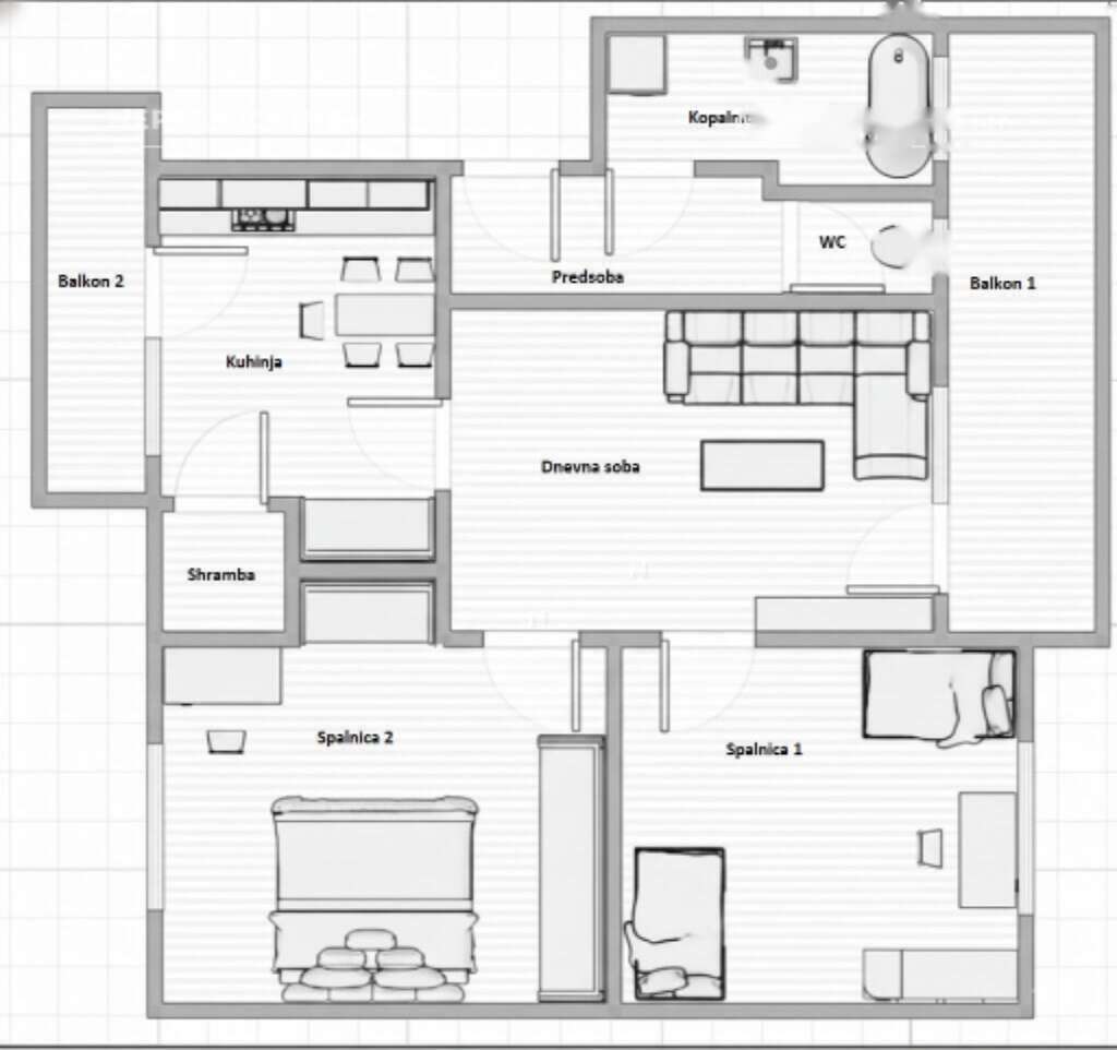 На жилой территории расположены две спальные комнаты, гостиная, просторный коридор, кухня с обеденной зоной, ванная и отдельный туалет. В распоряжении владельцев два балкона общей площадью 13 м², где можно наслаждаться свежим воздухом, не покидая квартиры. Кроме того, в стоимость включен подвал площадью 14 м².