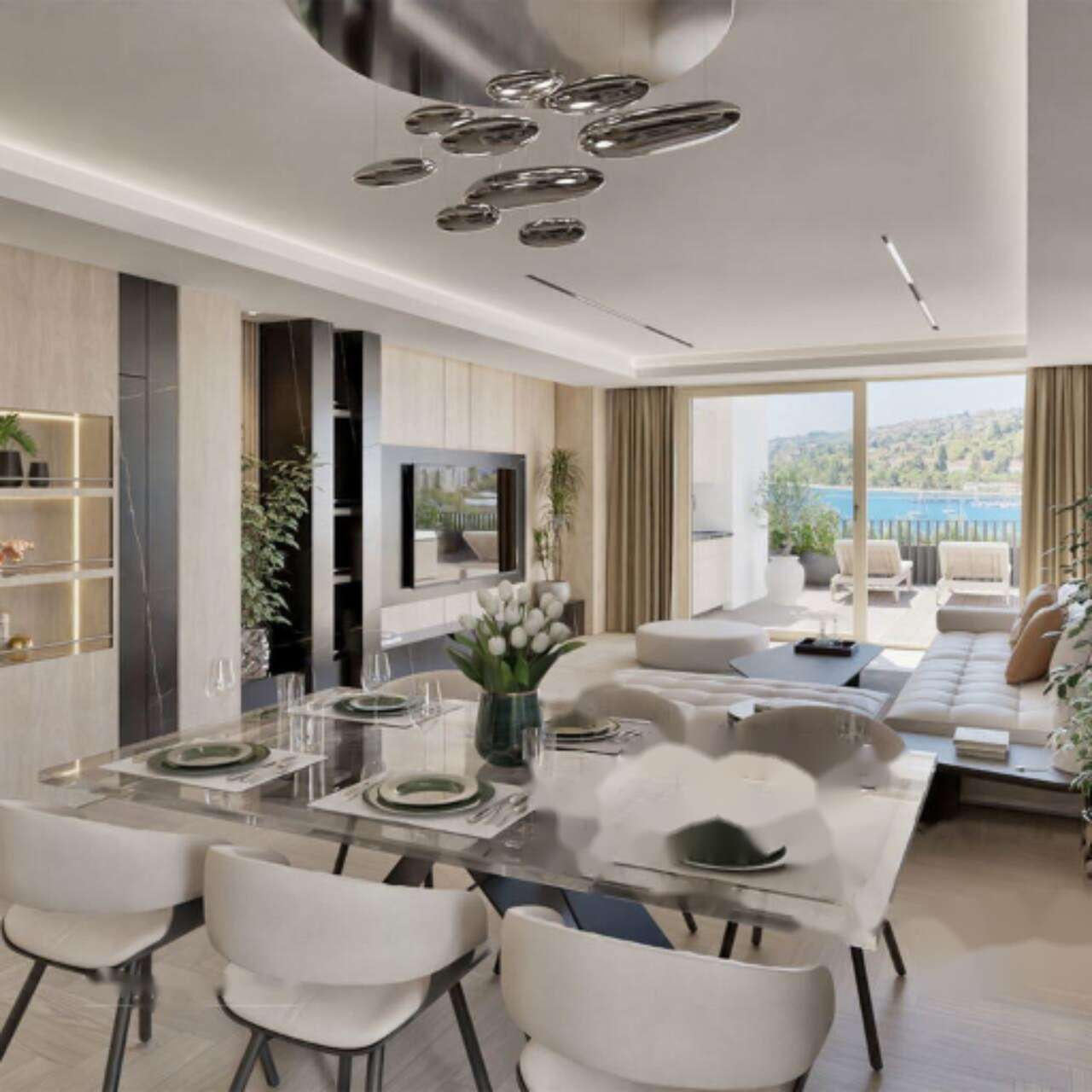 Жилая площадь включает в себя открытую планировку, объединяющую кухню, столовую и гостиную, а также две спальни, каждая из которых оборудована собственной ванной. В число удобств входят вестибюль на входе, гардеробная, техническое помещение и отдельные санузлы. Ориентация апартаментов отличается: спальни смотрят на северо-восток, тогда как гостиная и терраса выходят на северо-запад.