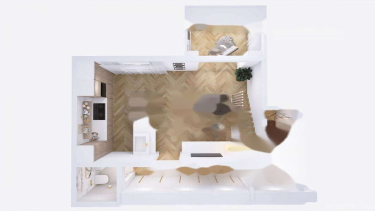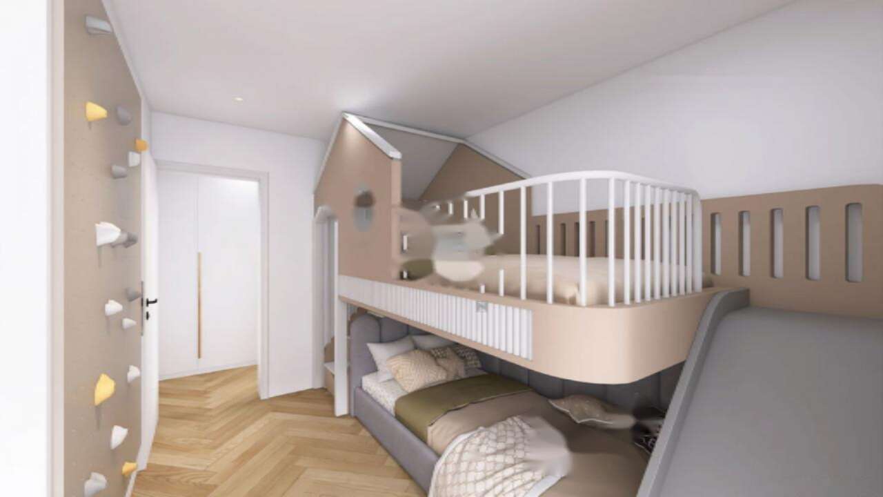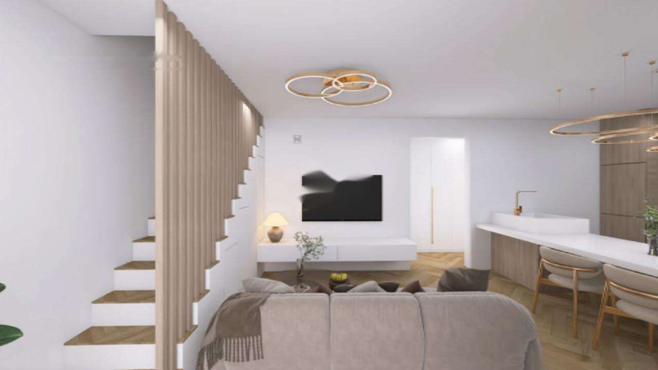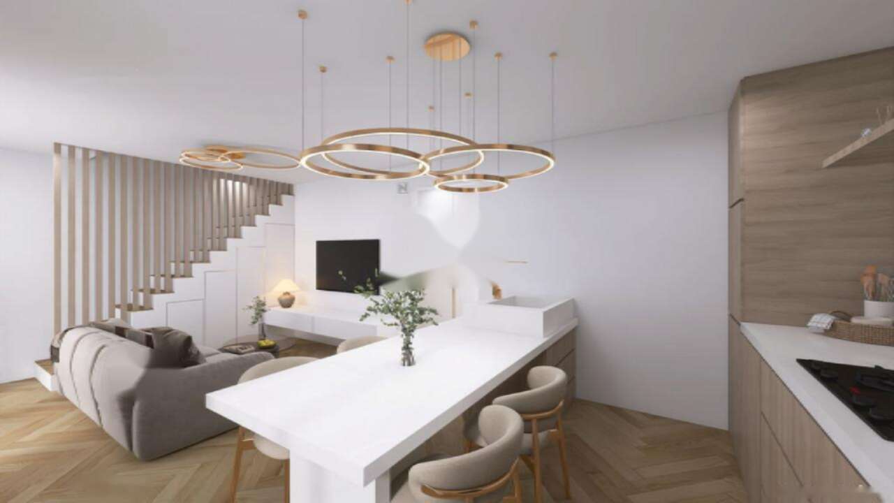 Квартира имеет два уровня. На нижнем уровне размещены просторный коридор с обильным количеством мест для хранения, кухня с зоной столовой и светлая гостиная с выходом на закрытую лоджию, которая ведет на террасу и огражденный атриум площадью 24 м². Кроме этого, на первом этаже имеется отдельный гостевой туалет. На верхнем этаже расположены две светлые спальни, одна из которых оснащена закрытой лоджией, а также ванная комната.