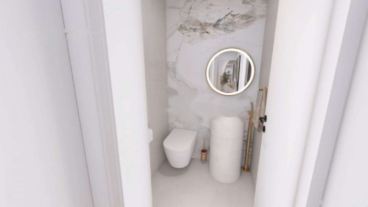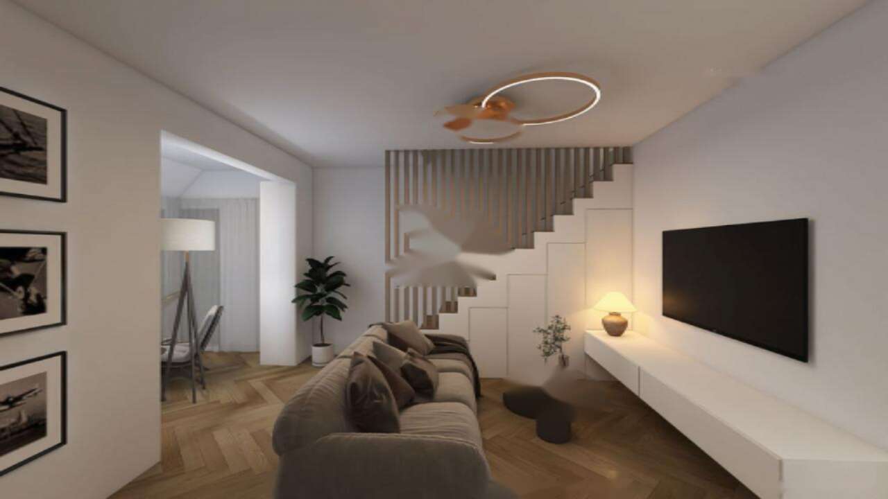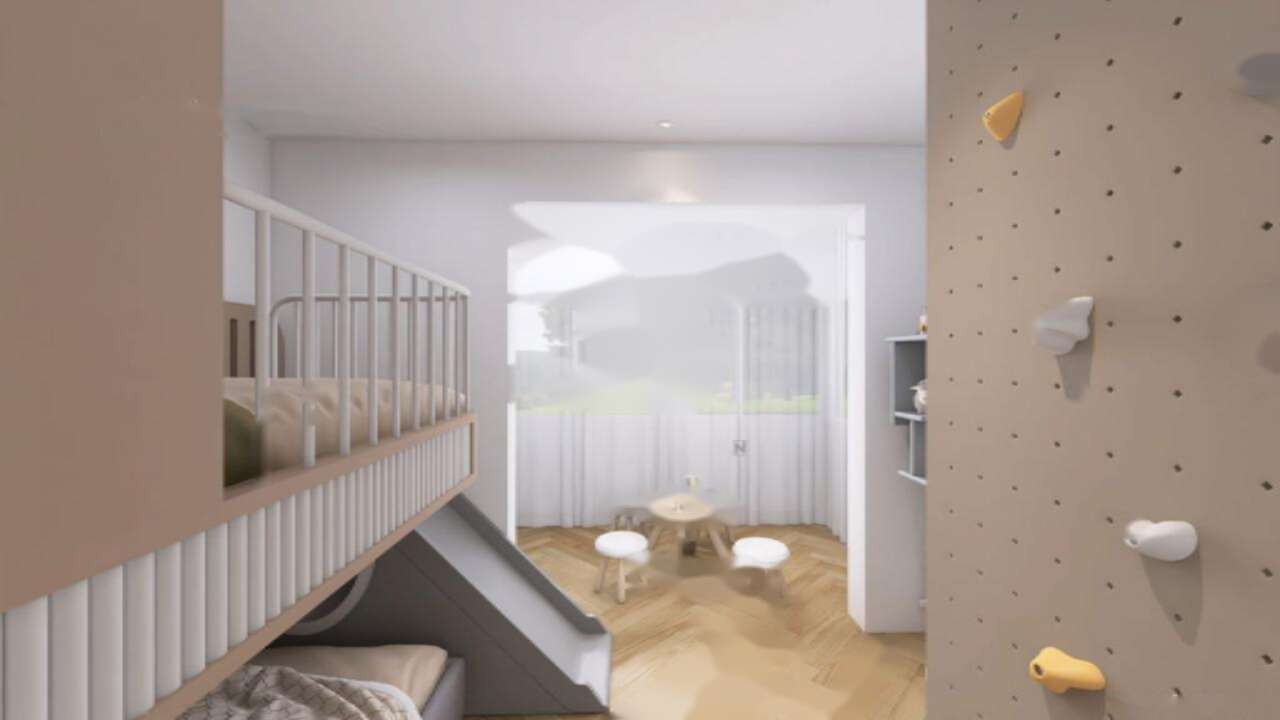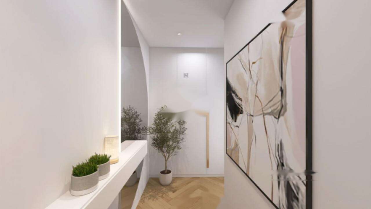 Квартира имеет два уровня. На нижнем уровне размещены просторный коридор с обильным количеством мест для хранения, кухня с зоной столовой и светлая гостиная с выходом на закрытую лоджию, которая ведет на террасу и огражденный атриум площадью 24 м². Кроме этого, на первом этаже имеется отдельный гостевой туалет. На верхнем этаже расположены две светлые спальни, одна из которых оснащена закрытой лоджией, а также ванная комната.