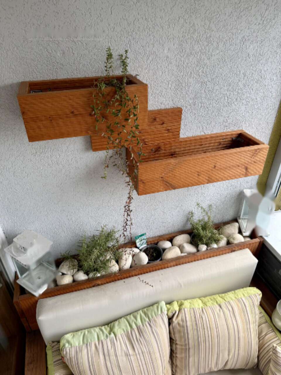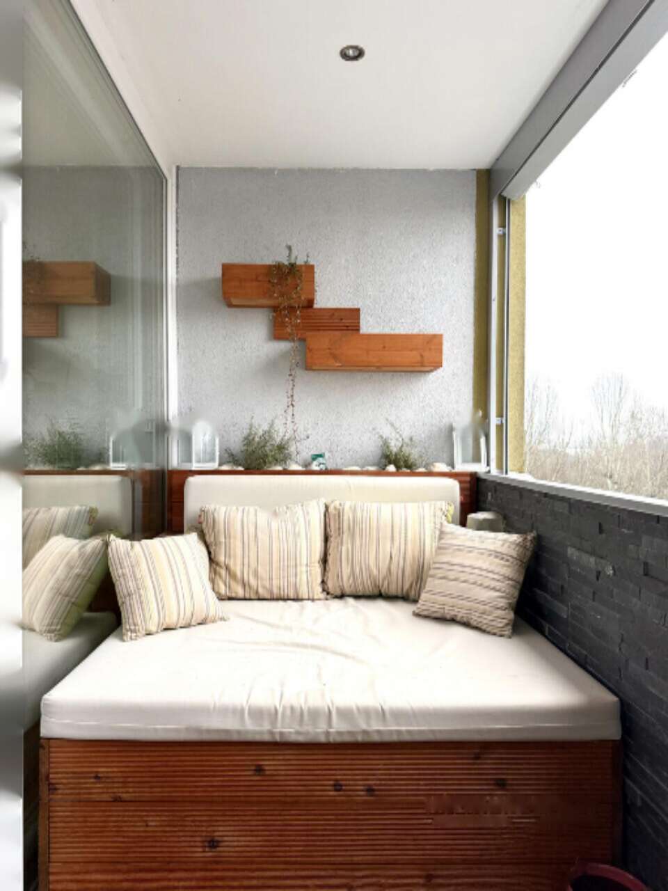 - балкон с настилом из сибирской лиственницы и декоративной стеной.