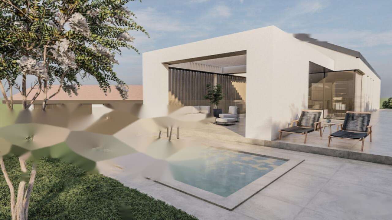 Архитектурные решения виллы сочетают элементы модерна и средиземноморского стиля. Низкая скатная крыша придаёт дому уютный вид. Белые стены с акцентами из дерева и камня гармонично вписываются в окружающий ландшафт.