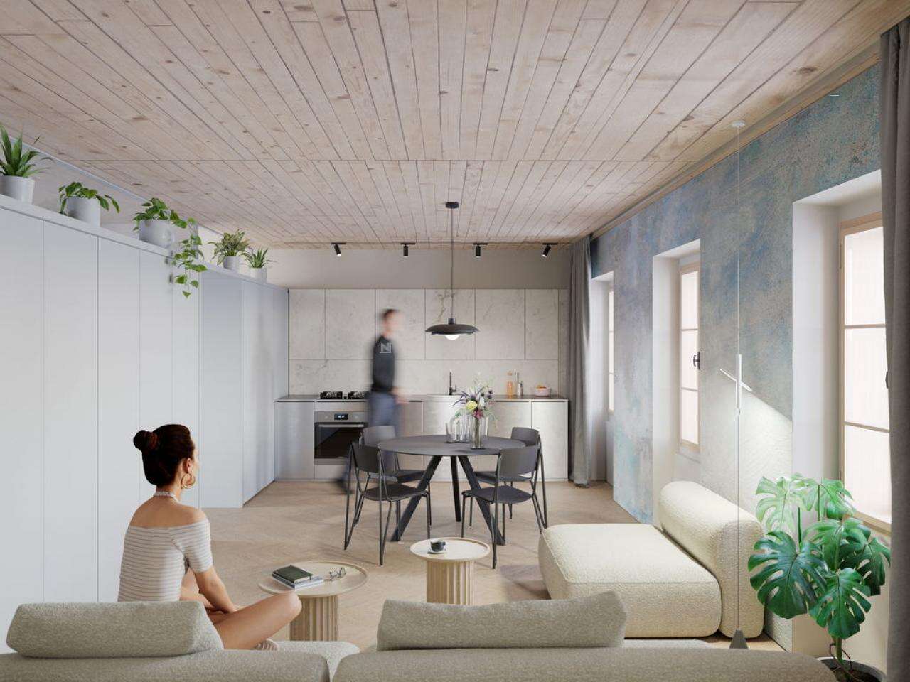 Квартира полностью обновляется с применением высококачественных материалов и современных технологий. Из окон открывается вид на Люблянский град, а квартира выходит на восток. Планировочное решение включает просторную гостиную, объединенную с кухней и столовой, уютную спальню с выходом на балкон, функциональное помещение и ванную комнату.