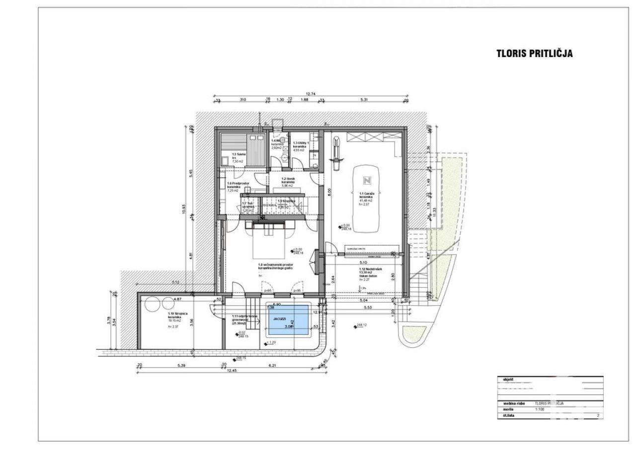 Первый этаж: многофункциональное пространство с выходом на террасу с джакузи, сауна, ванная комната, заманчивые подсобки, гараж и технические помещения.