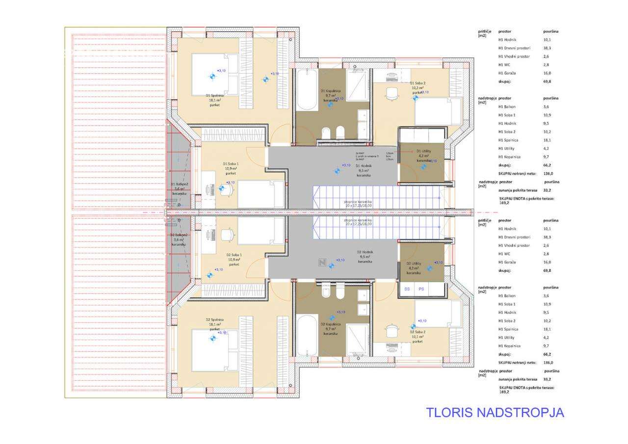 Посмотрите на планировку: правая единица H2 охватывает 169,20 м², из которых 136 м² приходятся на внутренние помещения, а 33,2 м² занимают крытую террасу. Высота потолков достигает 2,70 м. Планировка выглядит следующим образом: