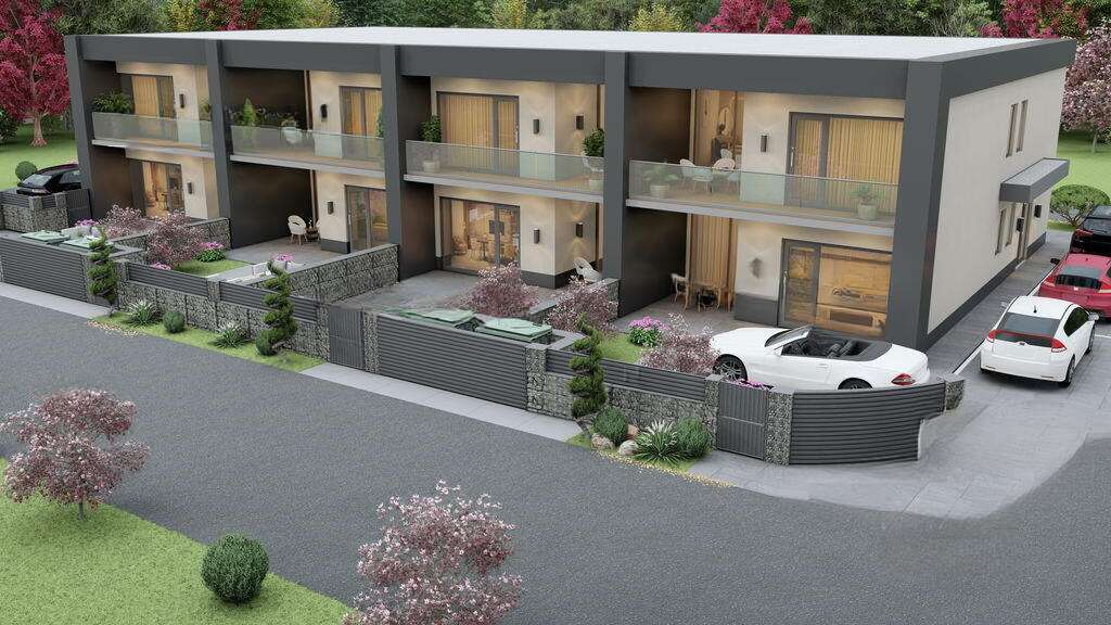 На продажу выставлен современный дом с террасой, находящийся в районе Поле, восточная часть Любляны. Это новостройка в тихом, благоустроенном месте, состоящая из двух уровней: первый и второй этажи. Здание завершено на четвёртой фазе строительства, сохраняя высокие строительные стандарты. Уже проведены основные работы по электрике и сантехнике. Последние этапы включают в себя завершение фасадных работ с установкой ограждений на балконах и благоустройство окружающей территории.