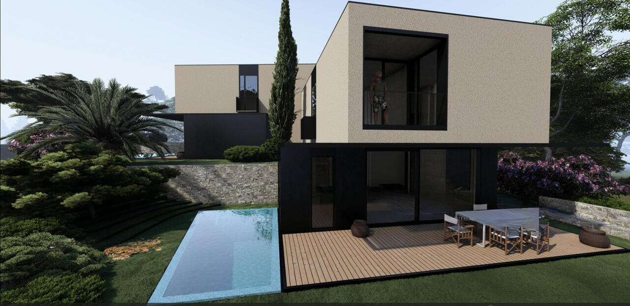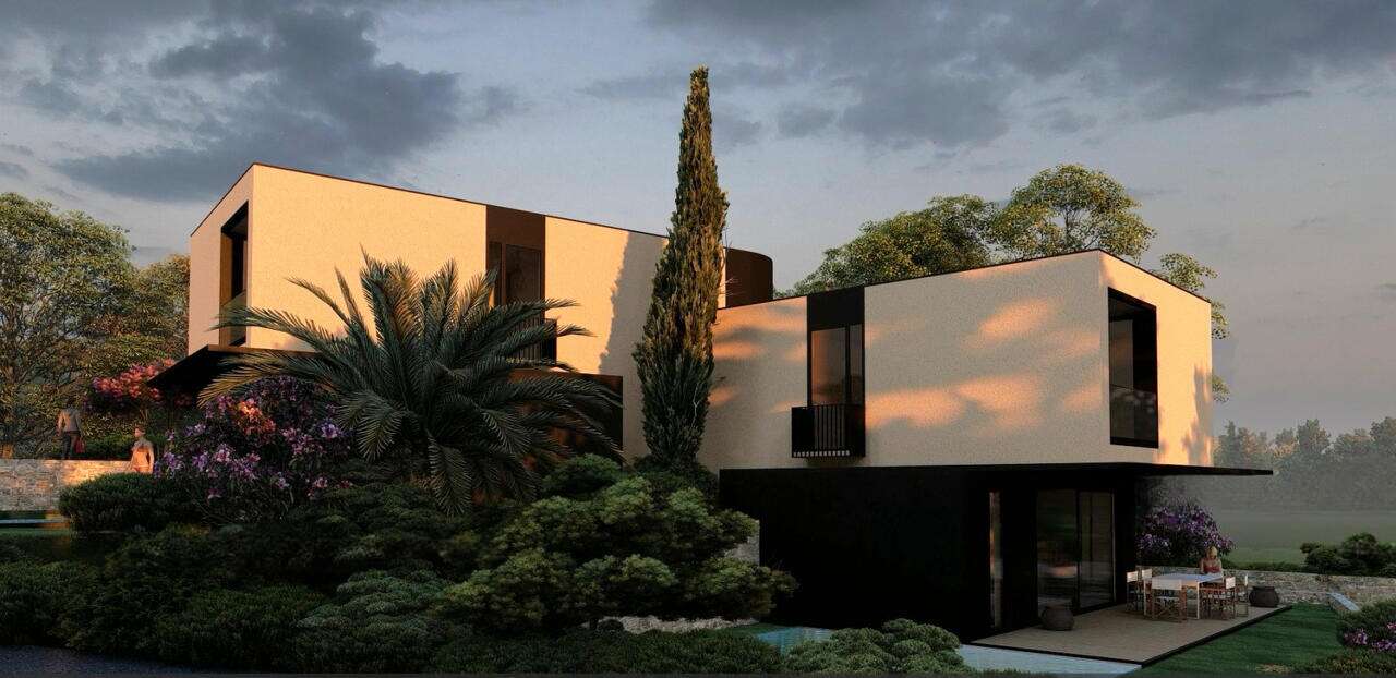 Территория будет облагорожена: лужайка размером 199 м² с автоматическим поливом, резервуар для дождевой воды ёмкостью 10 000 литров и облицованная керамикой терраса. Дом обеспечен видеонаблюдением, охранной системой и умными электрическими решениями.