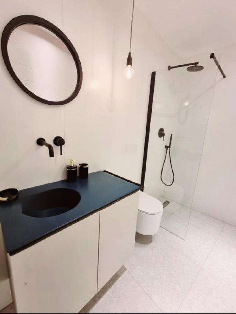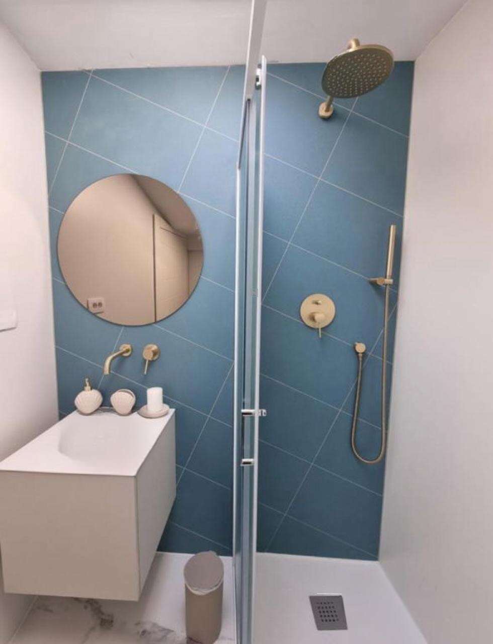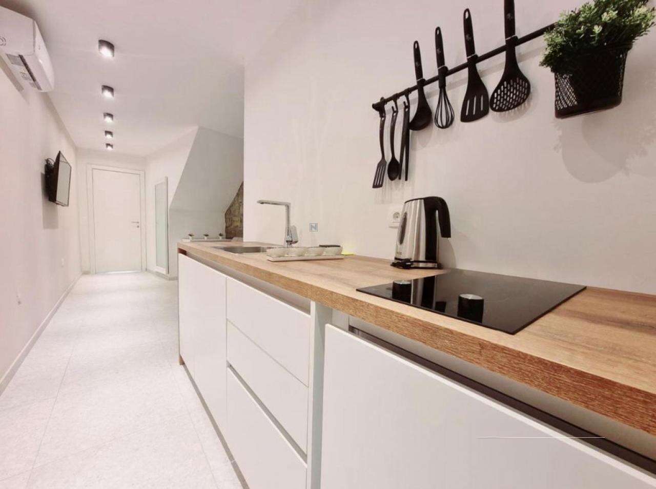 • Вторая квартира, тоже 45 м², находится на четвёртом этаже. Это светлое пространство с открытой планировкой гостиной и кухни, откуда видно море и гавань. В квартире предусмотрена просторная ванная и спальня с террасой.