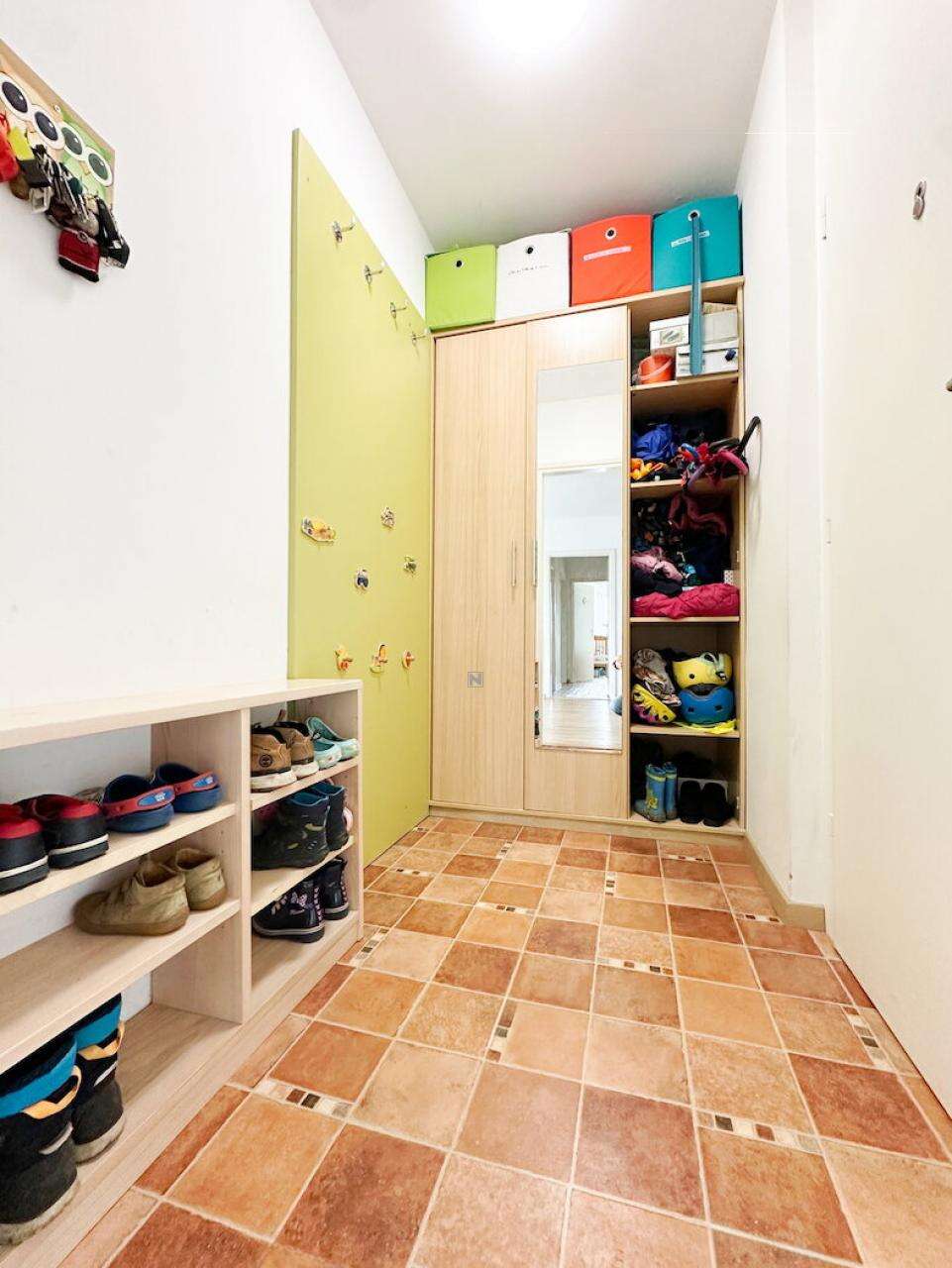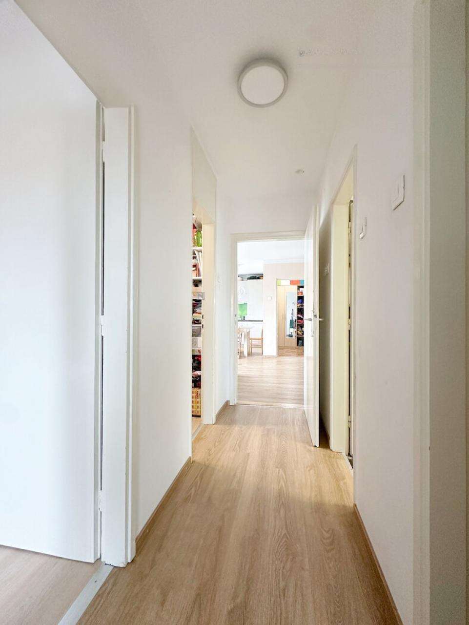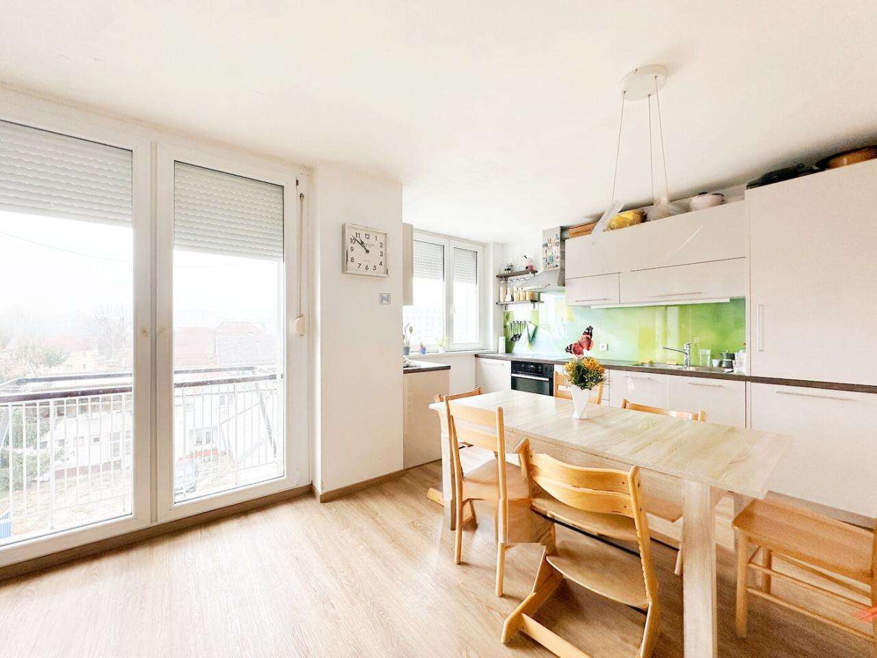 Квартира предлагает открытую и практичную планировку, позволяющую легко трансформировать пространство благодаря не несущим межкомнатным стенам. С южной и юго-западной стороны открываются замечательные виды на Люблянский град и Головец.