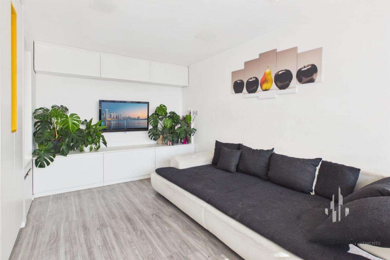 Жилая часть квартиры расположена на южной стороне, поэтому она всегда залита светом. Гостиная соединена с кухней и столовой, однако осталось достаточно пространства, чтобы создать комфортную и уютную атмосферу. Из гостиной можно выйти на балкон. Спальни ориентированы на северо-запад, что обеспечивает оптимальную температуру и тишину для комфортного сна. В 2015 году была проведена полная модернизация квартиры: заменены все коммуникации, установлены новые окна и обновлена внутренняя отделка. Мебель была изготовлена по индивидуальному заказу в сотрудничестве с дизайнерами компании Ропотгруп.