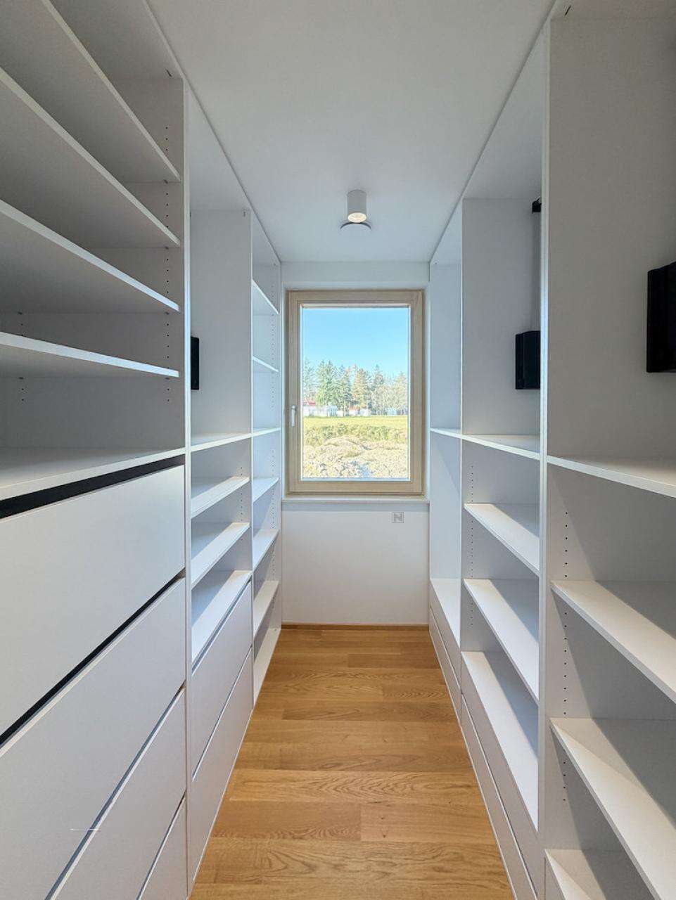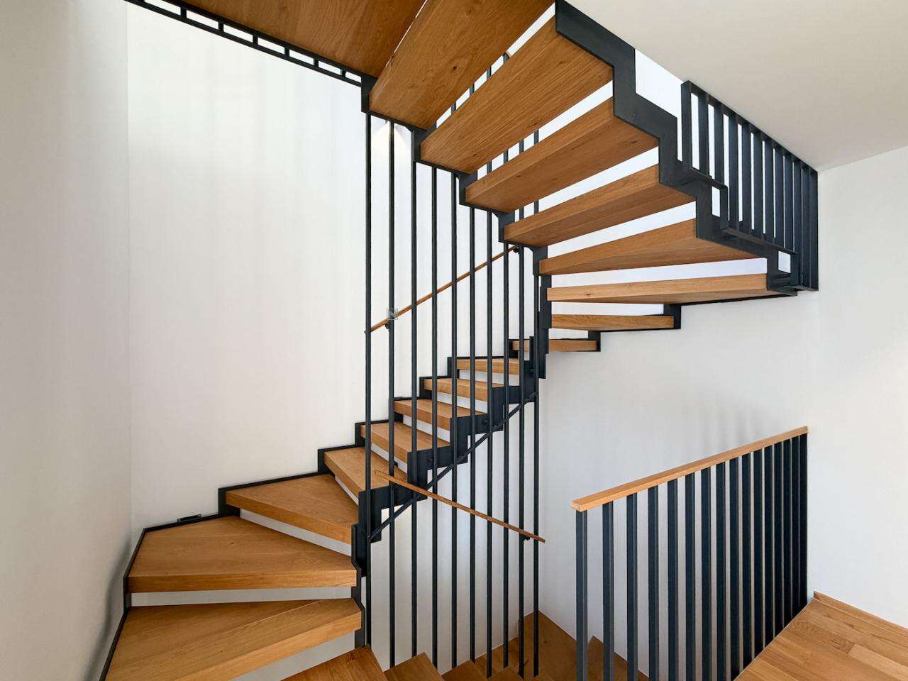 Эти апартаменты станут идеальным выбором для молодой семьи, пары, пенсионеров или как выгодное вложение. Интерьер спроектирован функционально. На первом этаже находится вход с лестницей, на втором — две детские комнаты с встроенными шкафами, ванная комната с душевой кабиной, спальня с личной ванной комнатой (с ванной и душем), а также гардеробная с встроенными элементами. Третий этаж представляет собой просторное открытое пространство с кухней, обеденной зоной и гостиной, ведущими на большую террасу, а также кладовую. Терраса занимает 25 м².