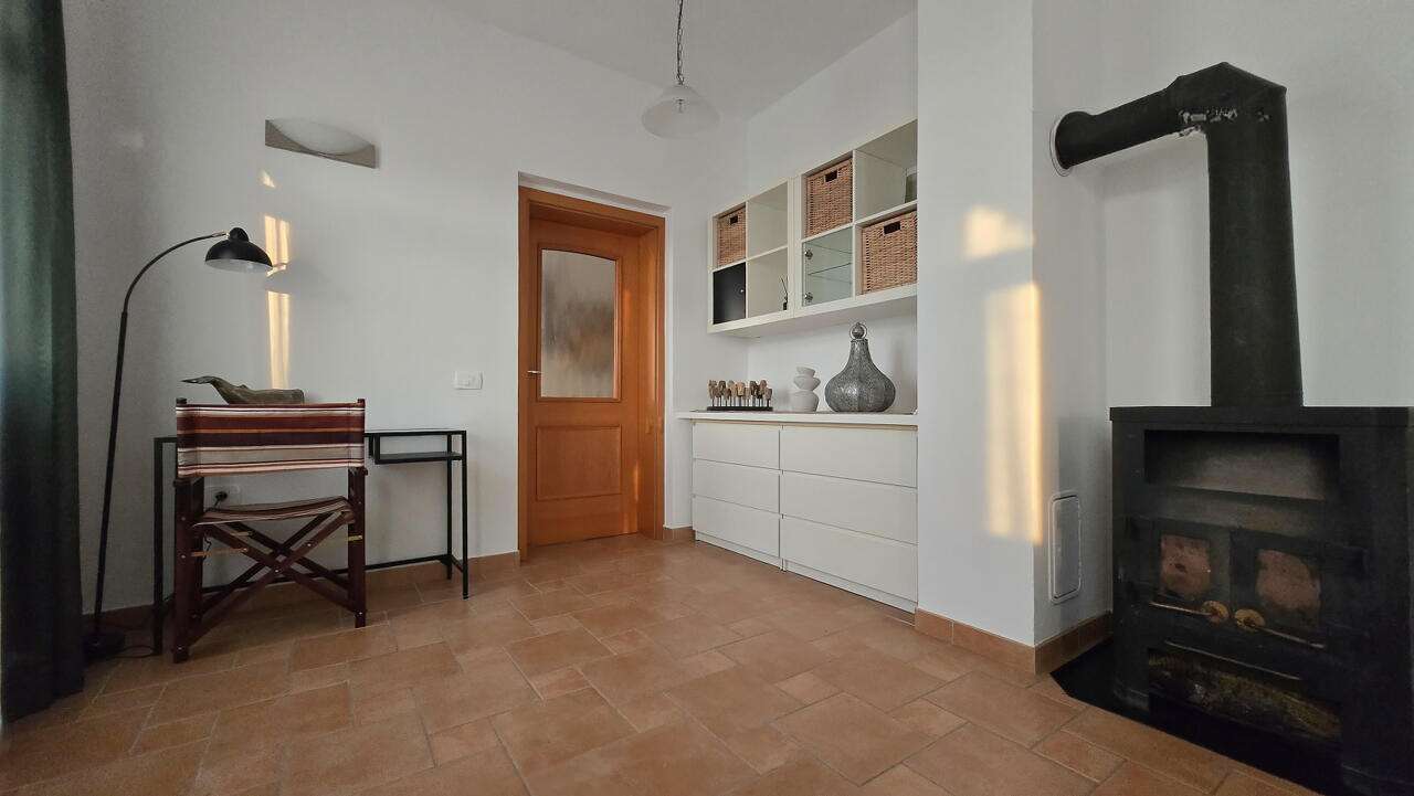 Первый этаж включает в себя просторную гостиную, совмещенную с кухней и столовой, из которой есть выход на террасу и сад с красивым видом на море, а также ванную комнату. Отопление осуществляется через центральное электрическое затопление с радиаторами, теплые полы в гостиной и ванной, а также имеется каминная печь.